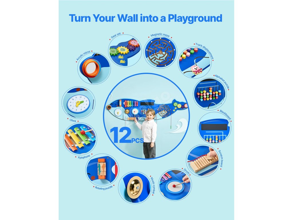 Montessori nástěnná senzoriální tabule, 12 aktivit, 3–12 let