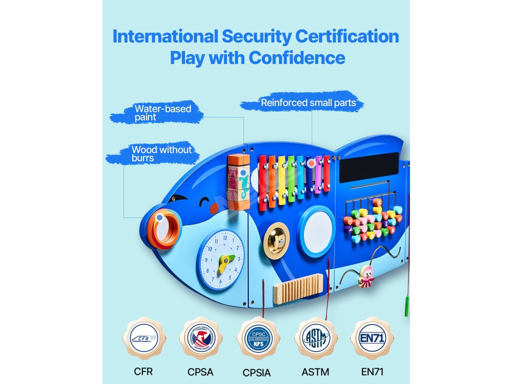Vyrobeno tak, aby vydrželo! Tato nástěnná tabule je mezinárodně certifikovaná jako bezpečná, je robustní a bezpečná a vytváří ekologické prostředí pro hraní vašeho dítěte.
