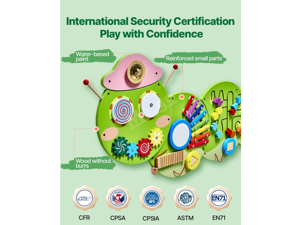 Vyrobeno tak, aby vydrželo! Tato nástěnná tabule je mezinárodně certifikovaná jako bezpečná, je robustní a bezpečná a vytváří ekologické prostředí pro hraní vašeho dítěte.