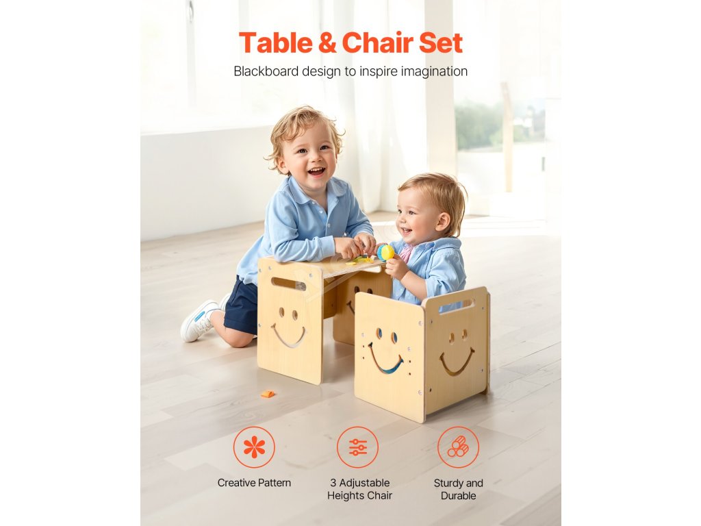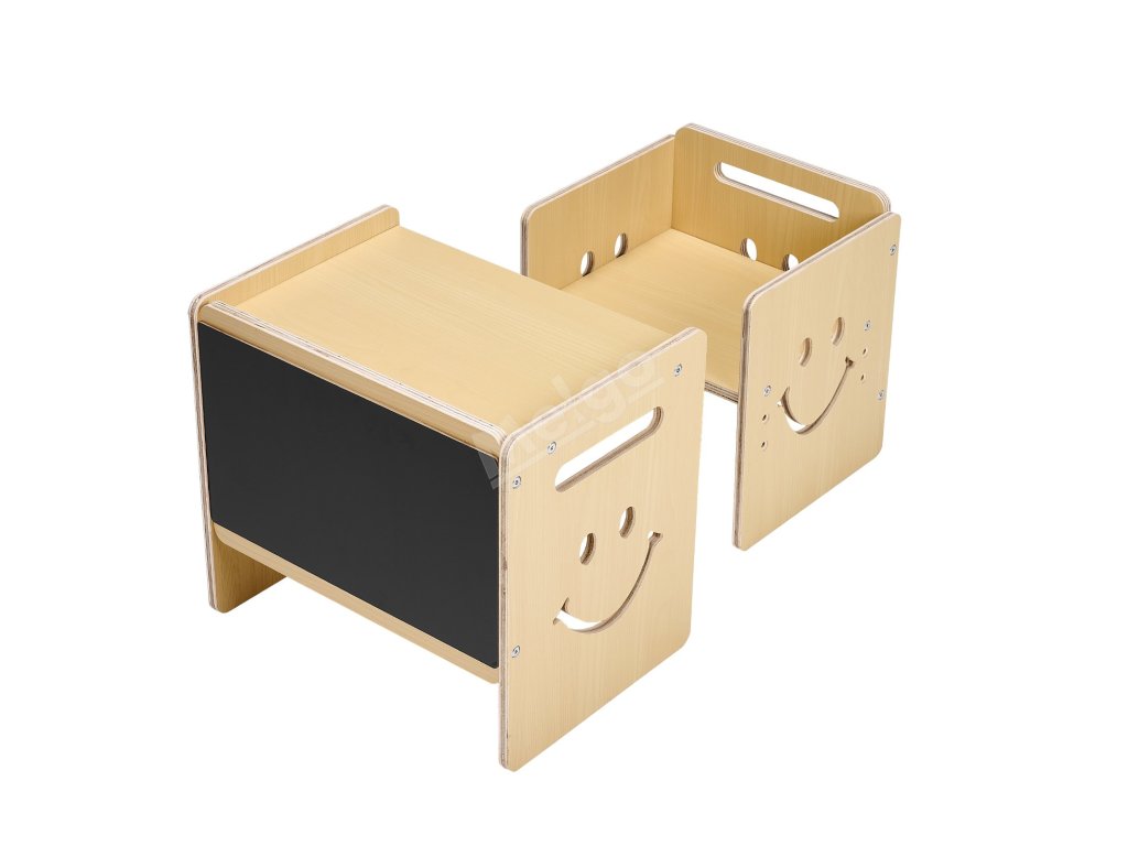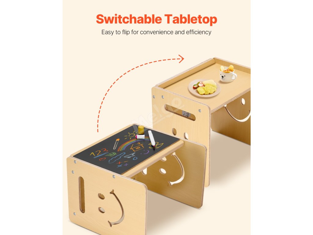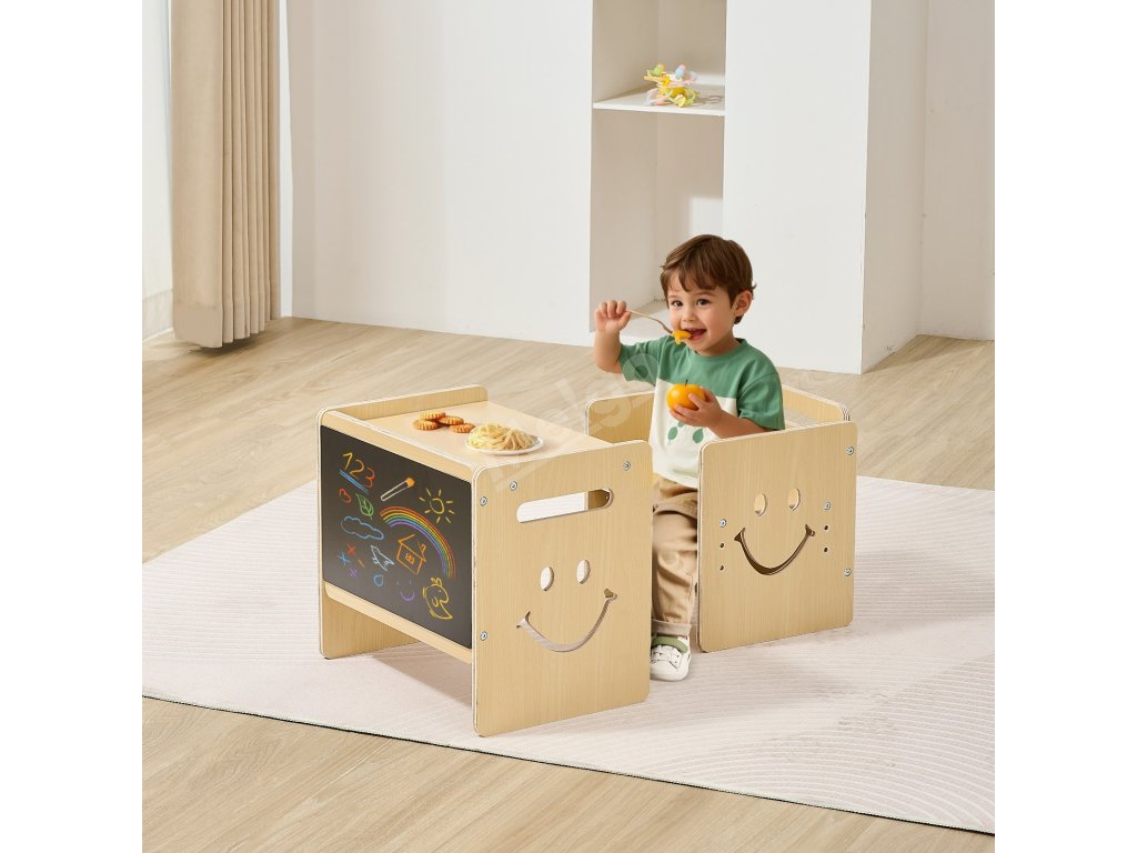 Tato sada stolu a židle na kojení má povrch s křídovou tabulí a 3 nastavitelné výšky (5,2 palce, 6,6 palce, 8 palců). Je vyrobena z odolné topolové překližky se zaoblenými hranami. Rychle se přemění na tabuli s křídou a lze ji použít jako podnožku nebo židličku pro batolata.