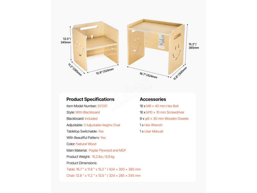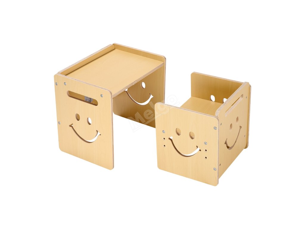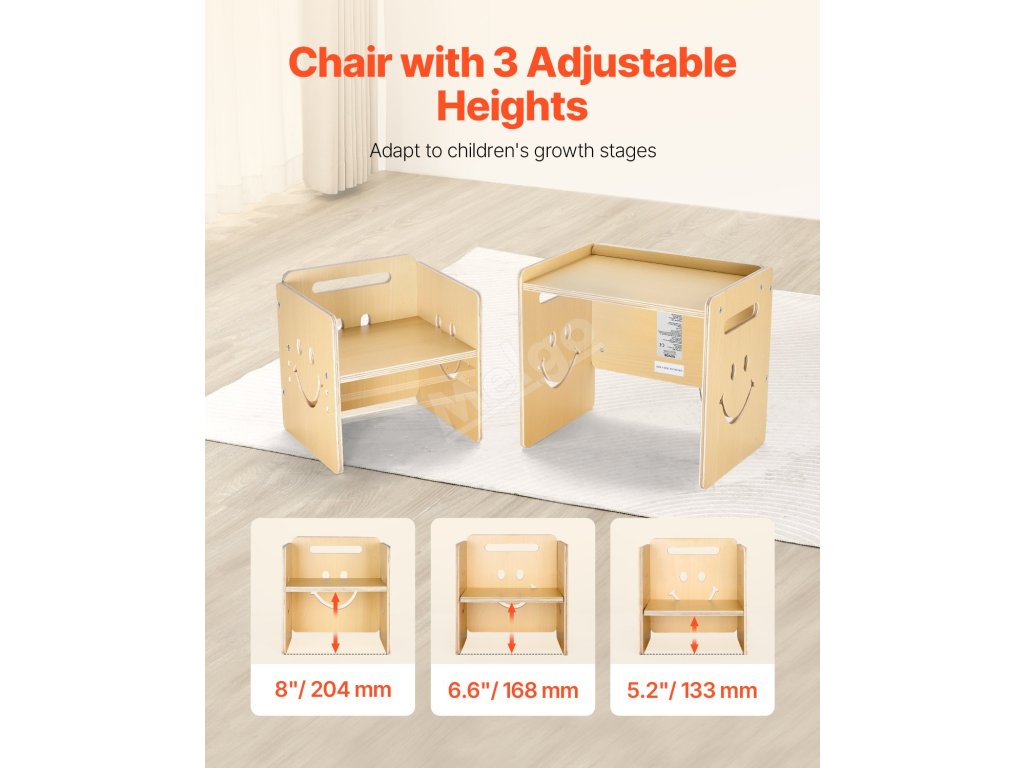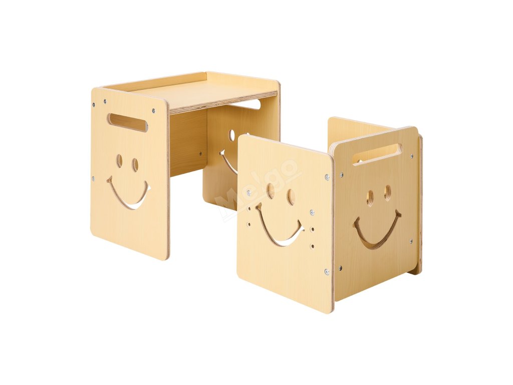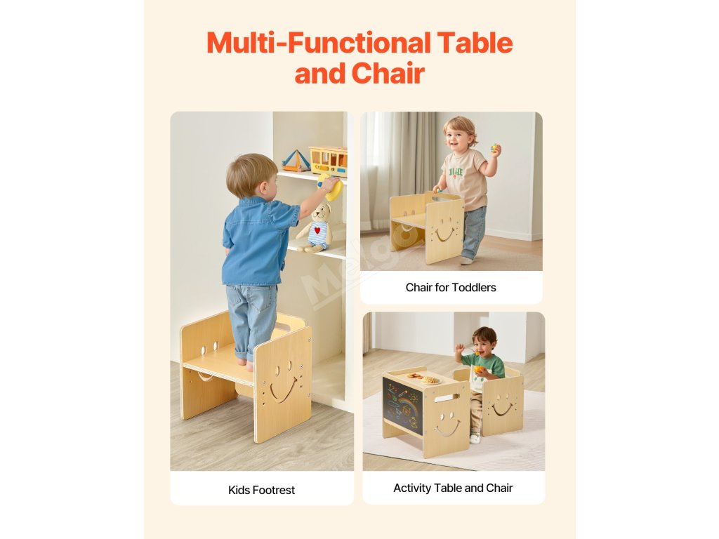 Tato sada stolu a židle na kojení má povrch s křídovou tabulí a 3 nastavitelné výšky (5,2 palce, 6,6 palce, 8 palců). Je vyrobena z odolné topolové překližky se zaoblenými hranami. Rychle se přemění na tabuli s křídou a lze ji použít jako podnožku nebo židličku pro batolata.