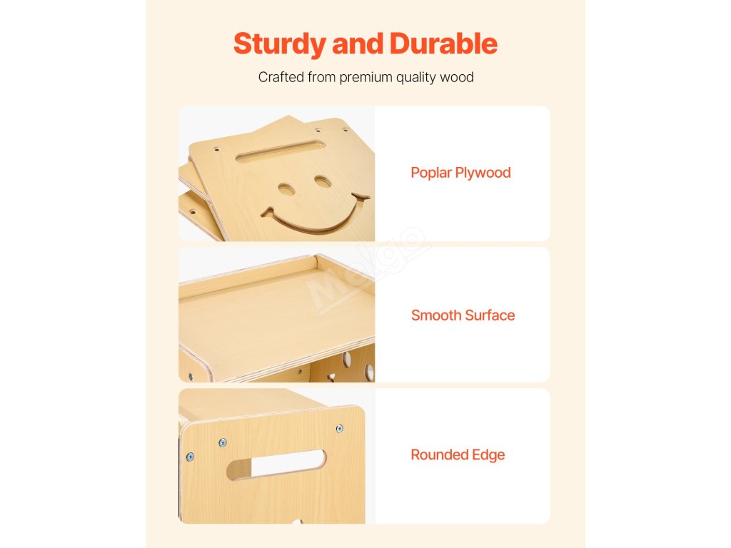 Tento nábytek Montessori je vyroben z odolné topolové překližky a má zaoblené rohy, které snižují riziko zranění. Jeho robustní nosnost a snadno omyvatelný povrch zajišťují pohodlí, bezpečnost a stabilitu vašeho dítěte.