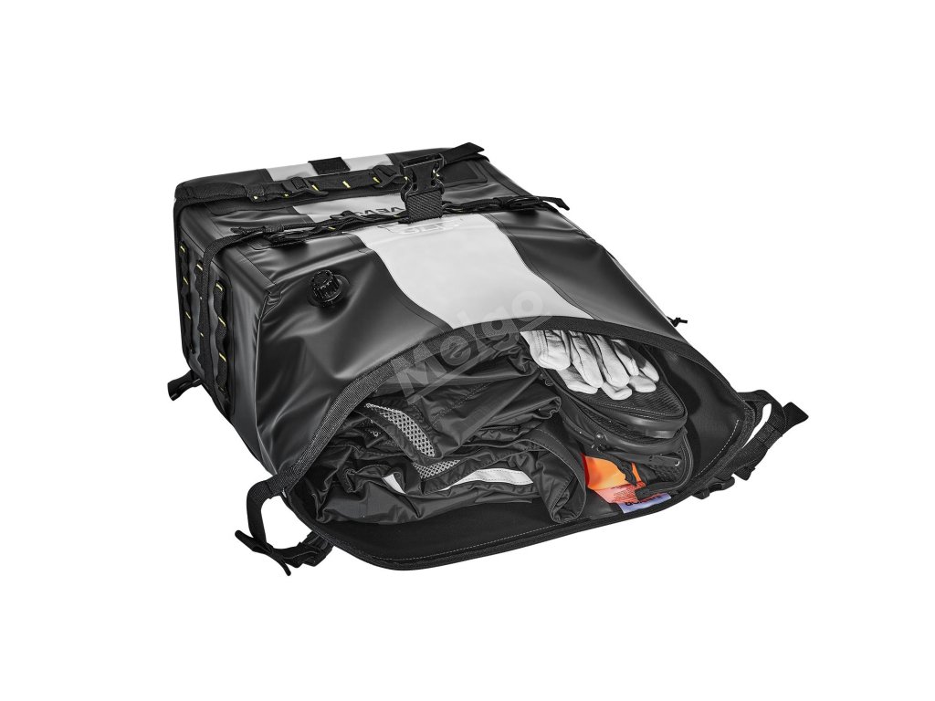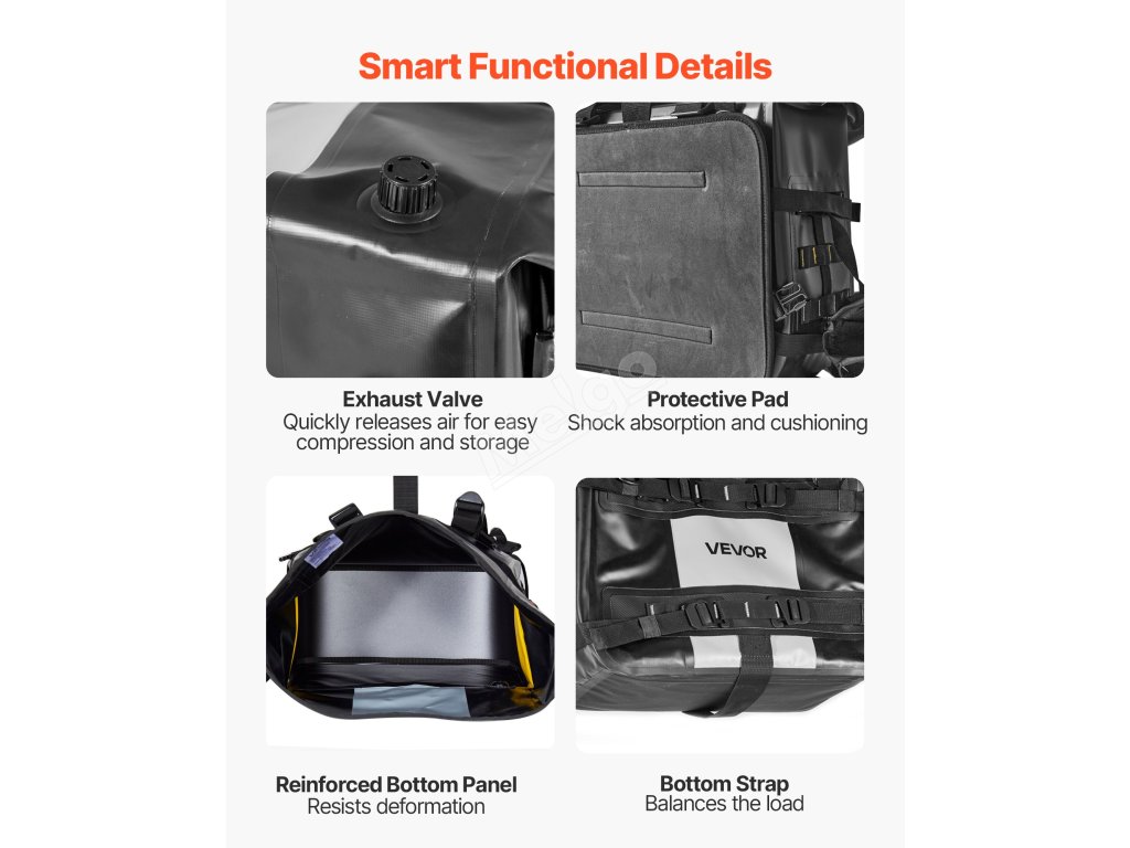 Každý detail je vyroben pro pohodlí. Ochranné polstrování a zesílený spodní panel odolávají deformacím, snižují vibrace a chrání předměty. Vyfukovací ventil umožňuje vodotěsnou brašnu pod sedlo motocyklu stlačit, čímž se zmenší úložný prostor a zrychlí balení.