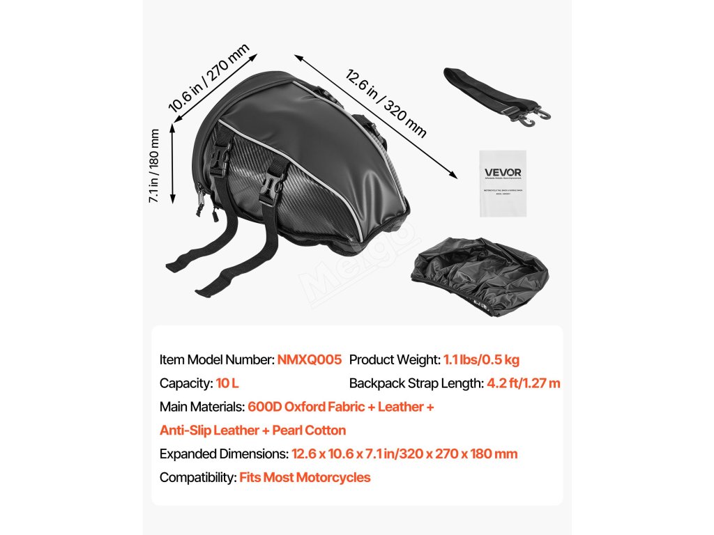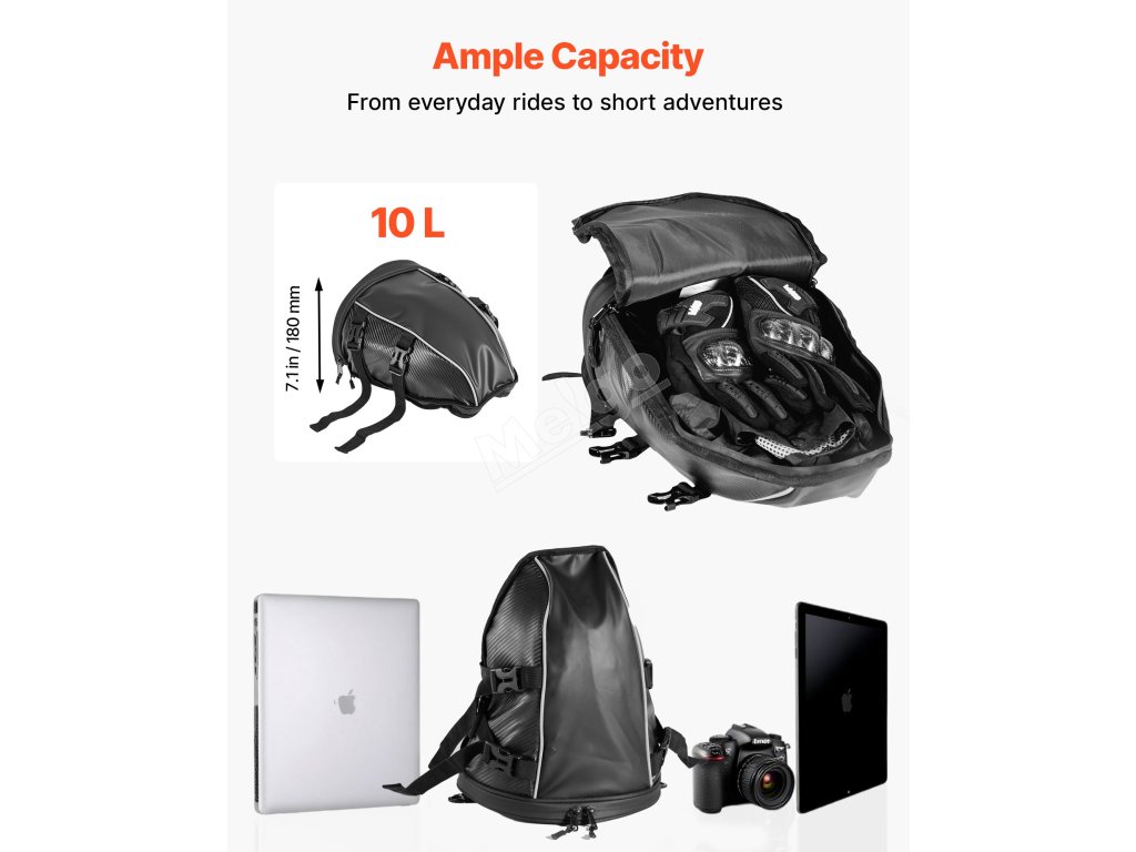 Motocyklová zadní taška 10 L s nepromokavým krytem, popruhem a kapsou