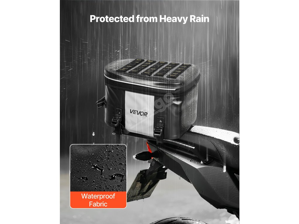Hladký vodotěsný zip a odolná tkanina odolná proti stříkající vodě a opotřebení zvyšují celkový uživatelský komfort brašny na sedadlo motocyklu.