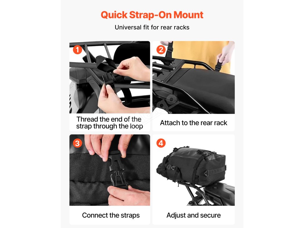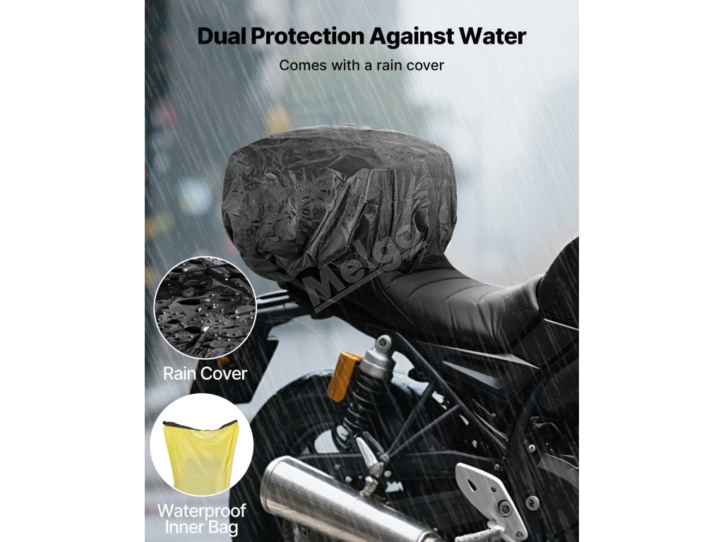 Hladký vodotěsný zip a odolná tkanina odolná proti stříkající vodě a opotřebení zvyšují celkový uživatelský komfort brašny na sedadlo motocyklu.