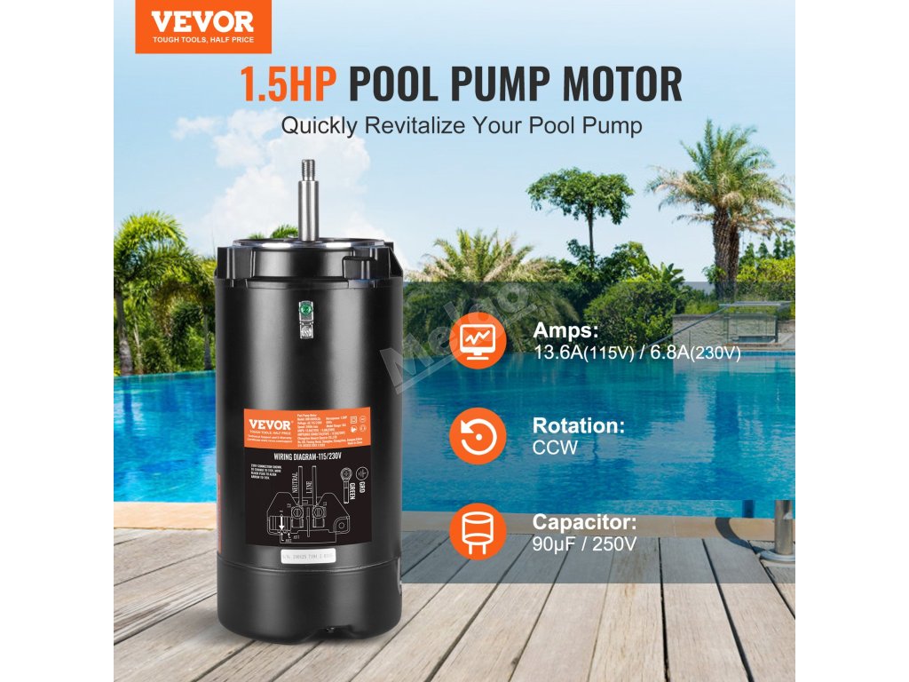 Napájejte své bazénové čerpadlo pomocí motoru VEVOR o výkonu 1,5 HP. Napětí AC115/230V, proud 13,6A (115V) / 6,8A (230V), vysoké otáčky 3450 ot/min, kondenzátor 90μF/250V, příruba model 56J, otáčení ve směru osy. Je správnou volbou pro oživení bazénového čerpadla a zajištění čistého a průzračného prostředí bazénu.