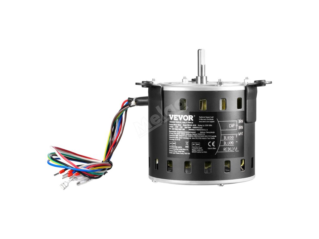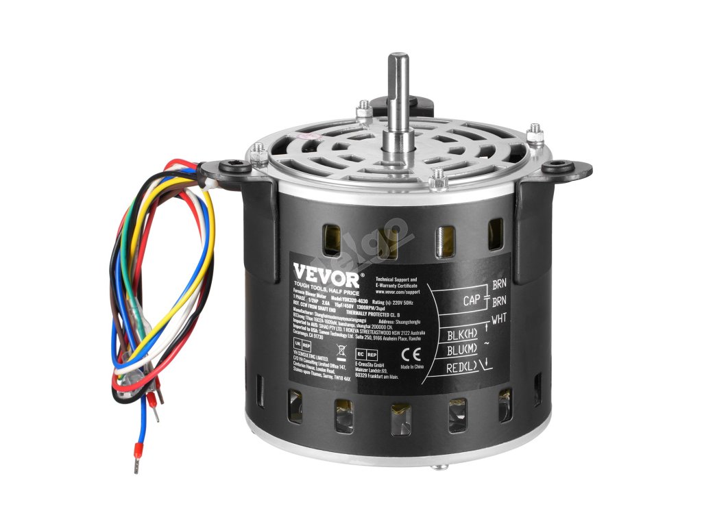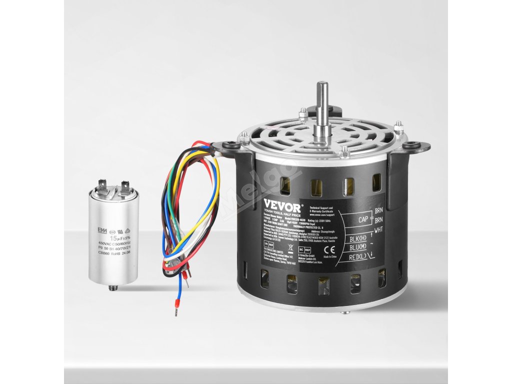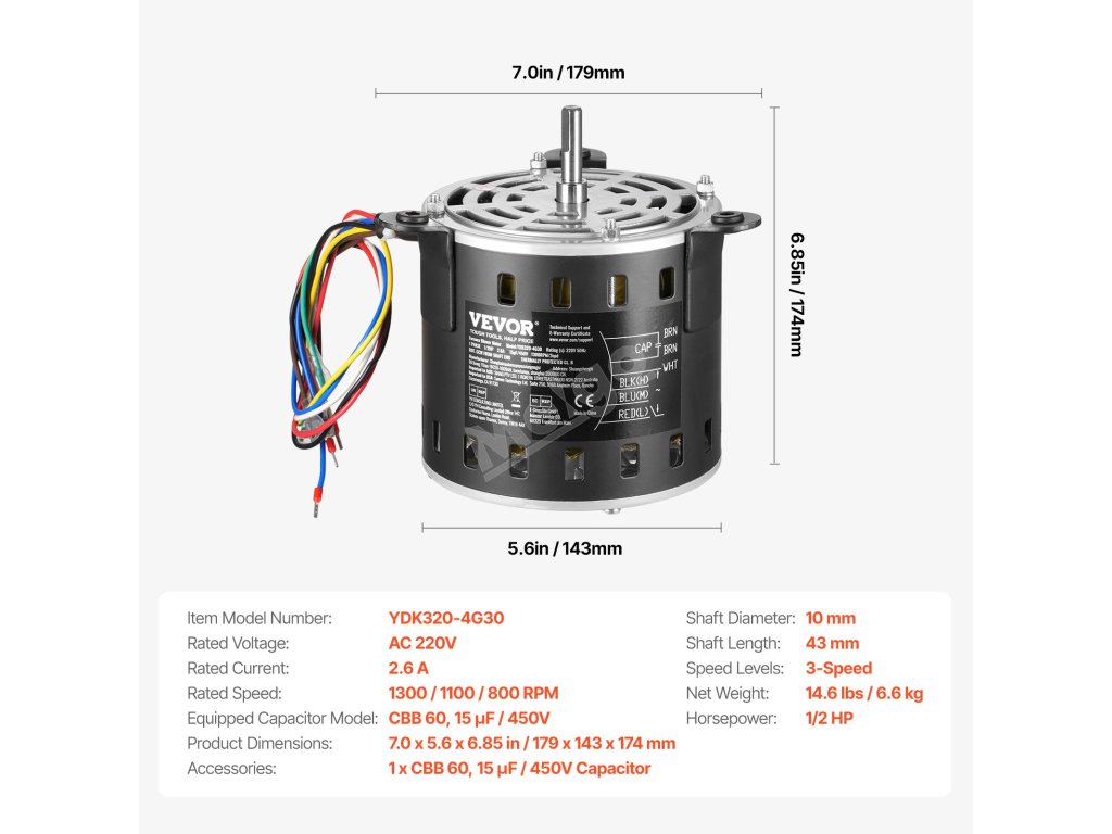 Motor ventilátora pece VEVOR 1/2HP má 3 rýchlosti (1300, 1100 a 800 ot./min.) a pracuje pri 220 V s prúdom 2,6A. S dĺžkou hriadeľa 20 mm, priemerom hriadeľa 10 mm, ROT. CCW od konca hriadeľa a kondenzátorom CBB60 15μF/450V je ideálnou voľbou pre klimatizačné kanálové systémy a pece.