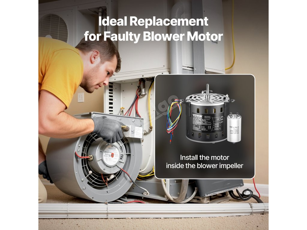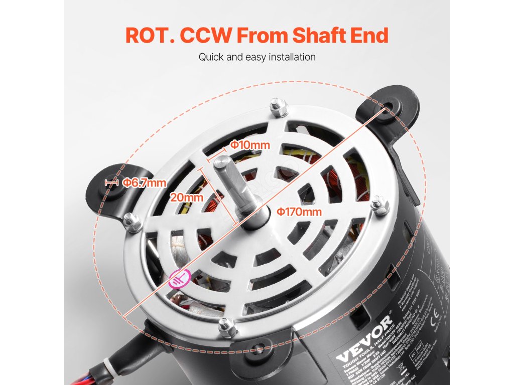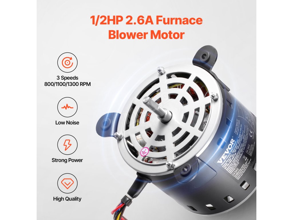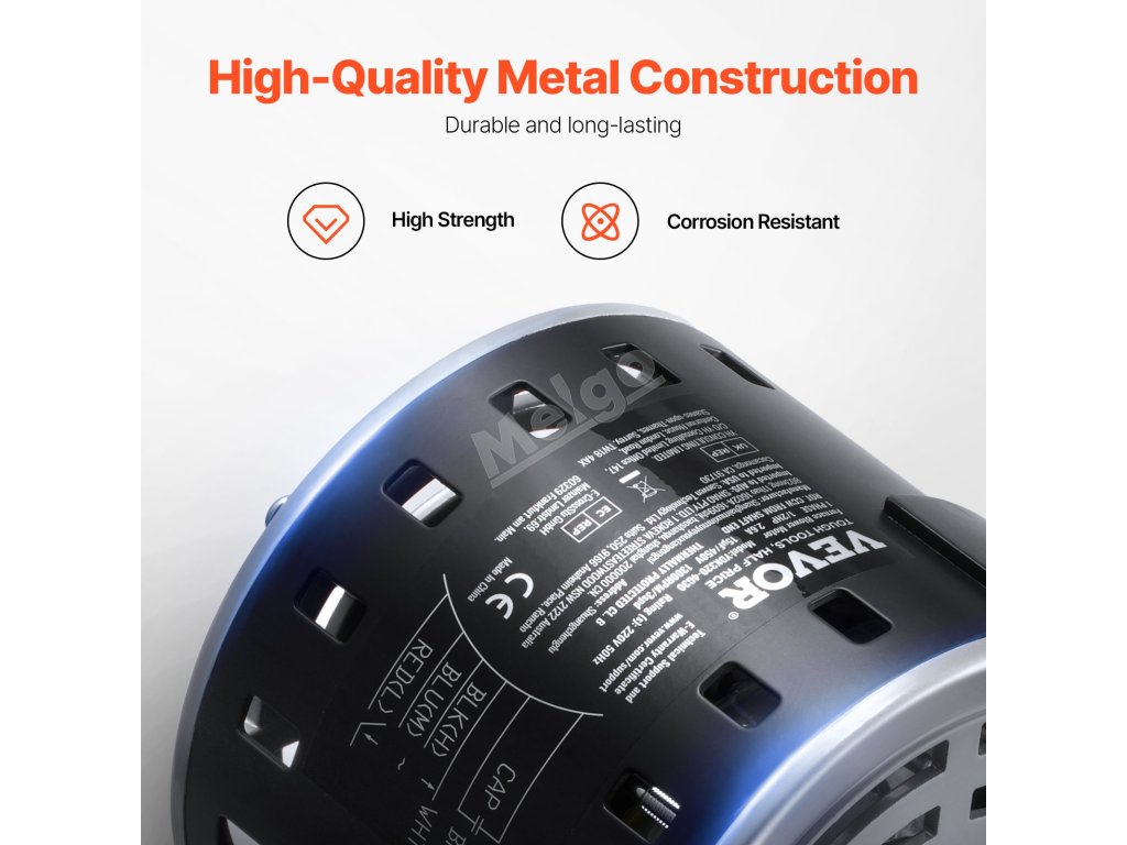Motor ventilátora pece VEVOR 1/2HP má 3 rýchlosti (1300, 1100 a 800 ot./min.) a pracuje pri 220 V s prúdom 2,6A. S dĺžkou hriadeľa 20 mm, priemerom hriadeľa 10 mm, ROT. CCW od konca hriadeľa a kondenzátorom CBB60 15μF/450V je ideálnou voľbou pre klimatizačné kanálové systémy a pece.