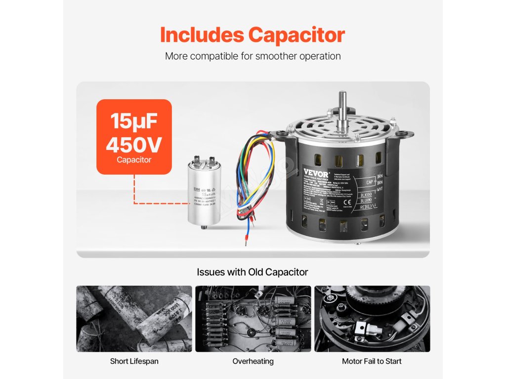Tento motor je vybavený dodatočným príslušenstvom (kondenzátor CBB60 15μF/450V), vďaka čomu odpadajú problémy so samostatným hľadaním kompatibilných komponentov, a je tak pohodlnejší a pripravený na použitie!