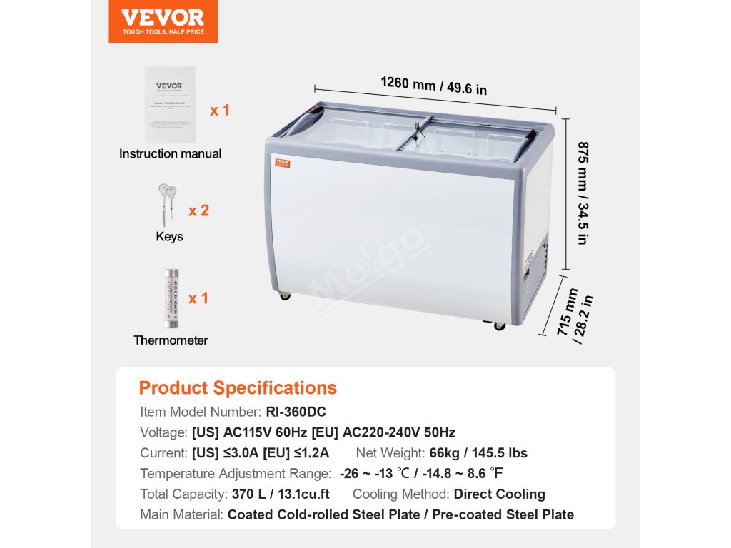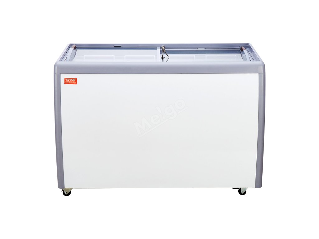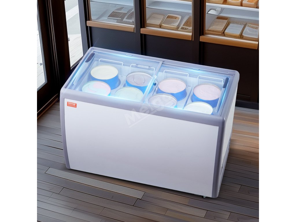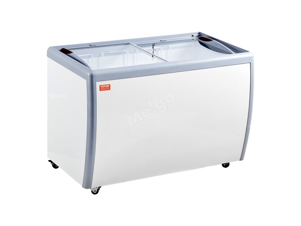 Mrazící truhla 370 L, skleněný vrch, 8 vaniček, 2 posuvné dveře