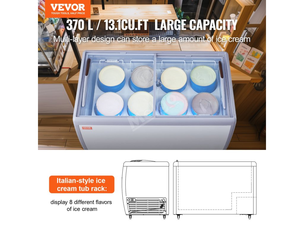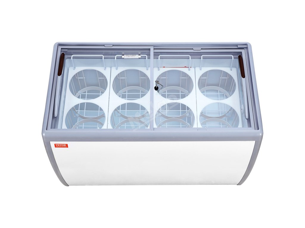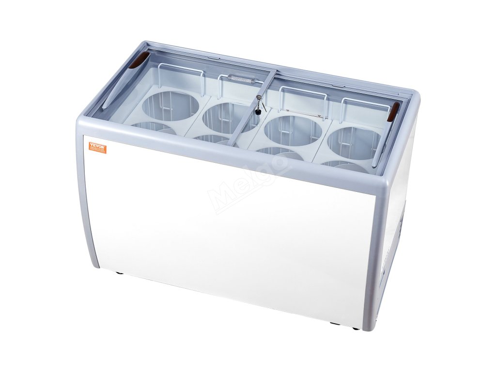 zmrzlinová vitrína o objemu 370 l s 8 velkými vaničkami, ve kterých lze prezentovat různé příchutě zmrzliny. Tato mraznička je vybavena vícestupňovou regulací teploty a systémem konstantní teploty, který šetří energii a je účinný.