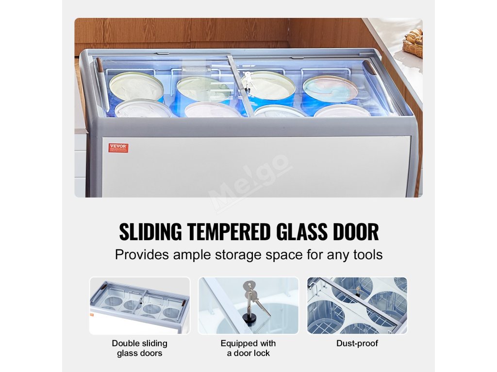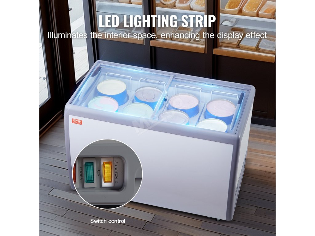 Velké vitríny, ve kterých lze prezentovat různé příchutě zmrzliny. Průhledná skleněná dvířka a LED osvětlení umocňují efekt vystavení.
