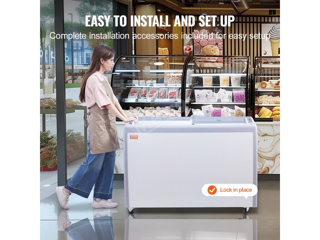 Mobilní mrazicí box se skleněnou deskou lze použít v kavárnách, nápojových barech, zmrzlinárnách, supermarketech a na dalších místech, kde umožňuje dlouhodobé vystavení zmrzliny.