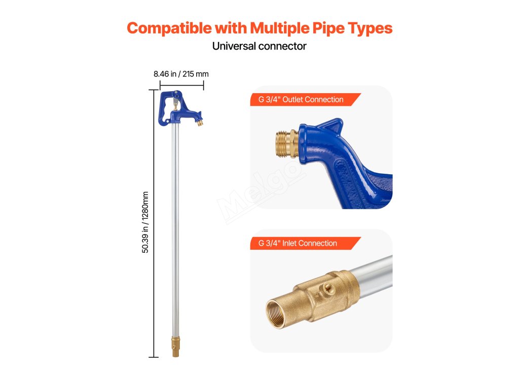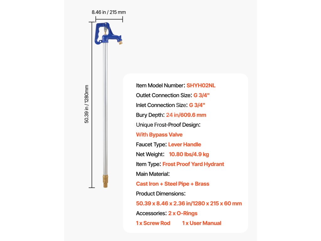 Mrazuvzdorný hydrant VEVOR má celkovou délku 4,2FT (1280 mm), hloubku zakopání 24 palců a konstrukci obtokového ventilu, která umožňuje plynulý průtok vody i za mrazu. Odolná konstrukce snižuje únik vody a zajišťuje dlouhou životnost, je ideální pro zalévání zahrady, mytí auta a zavlažování farmy.