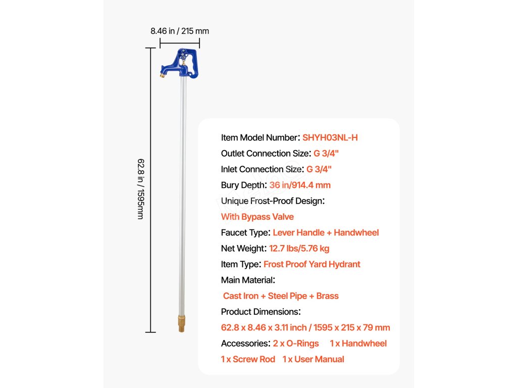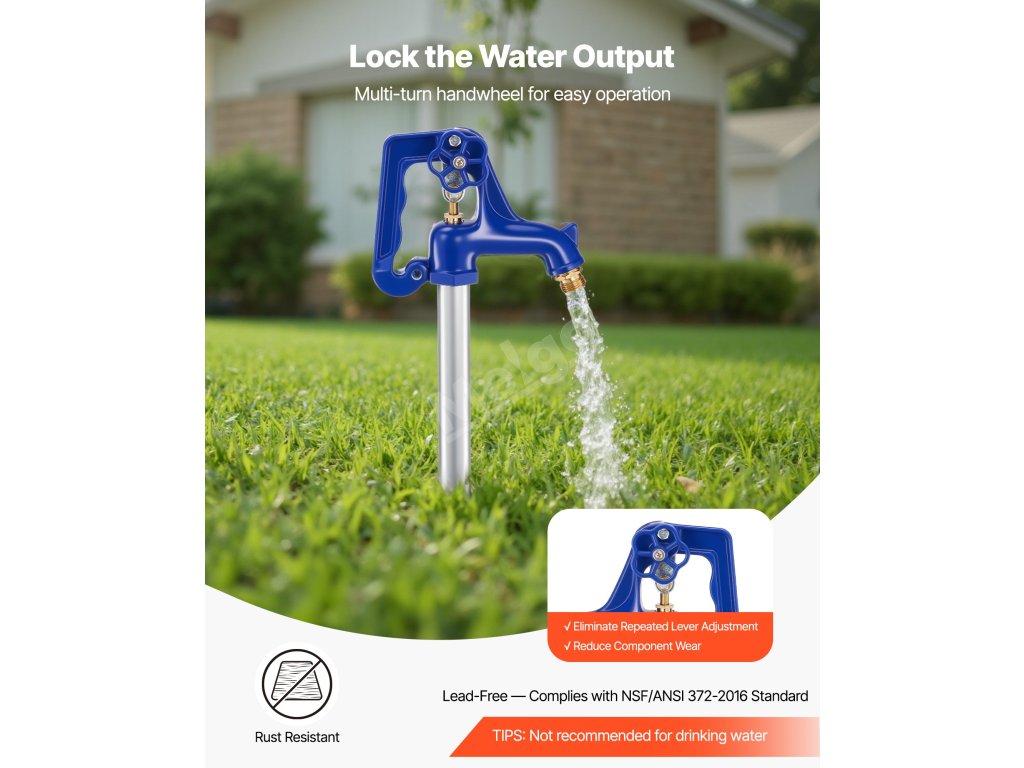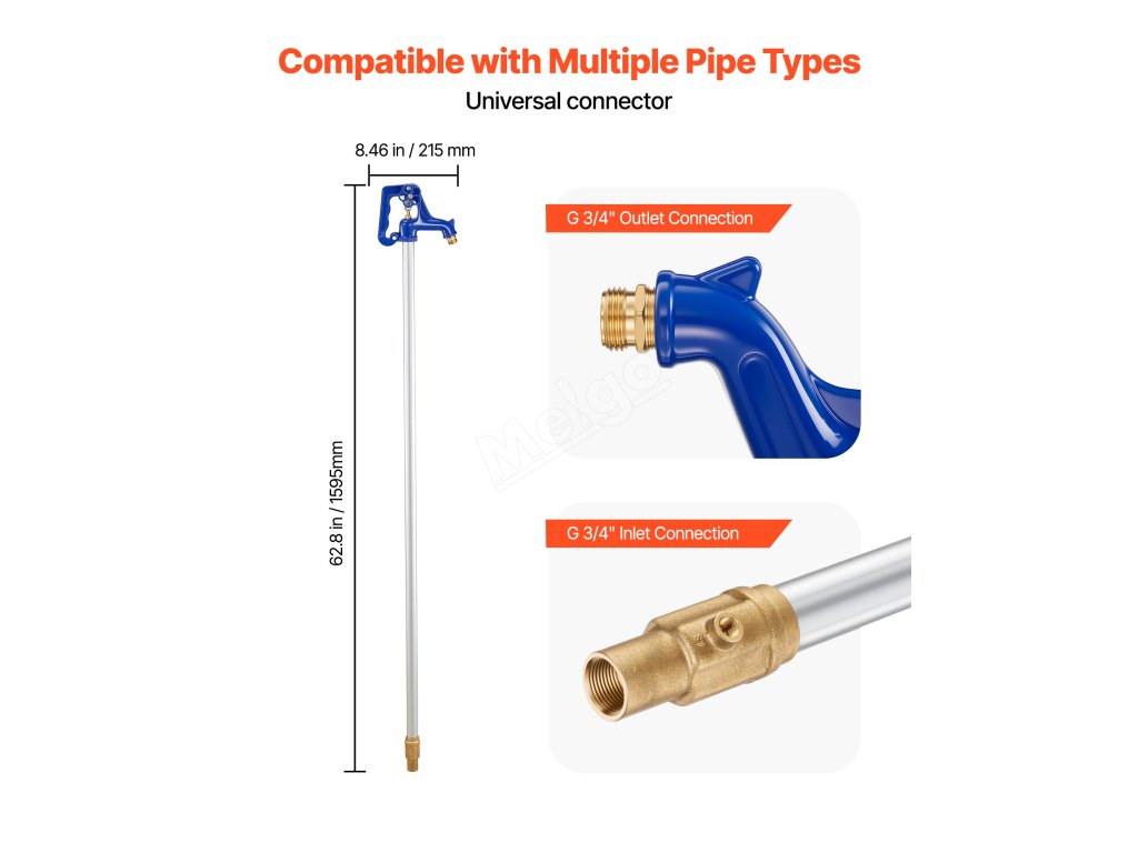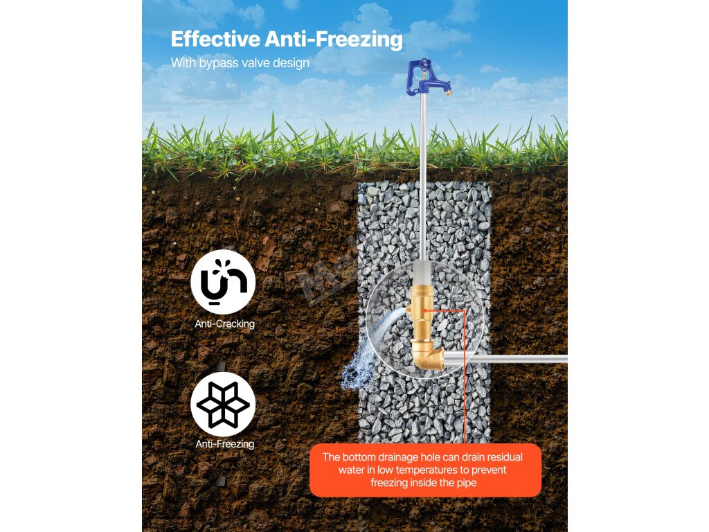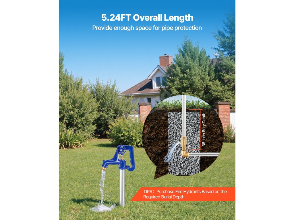 Mrazuvzdorný hydrant VEVOR má celkovou délku 1595 mm (5,24FT), hloubku uložení 36 palců a konstrukci obtokového ventilu, která umožňuje plynulý průtok vody i za mrazu. Odolná konstrukce snižuje únik vody a zajišťuje dlouhou životnost, je ideální pro zalévání zahrady, mytí auta a zavlažování farmy.