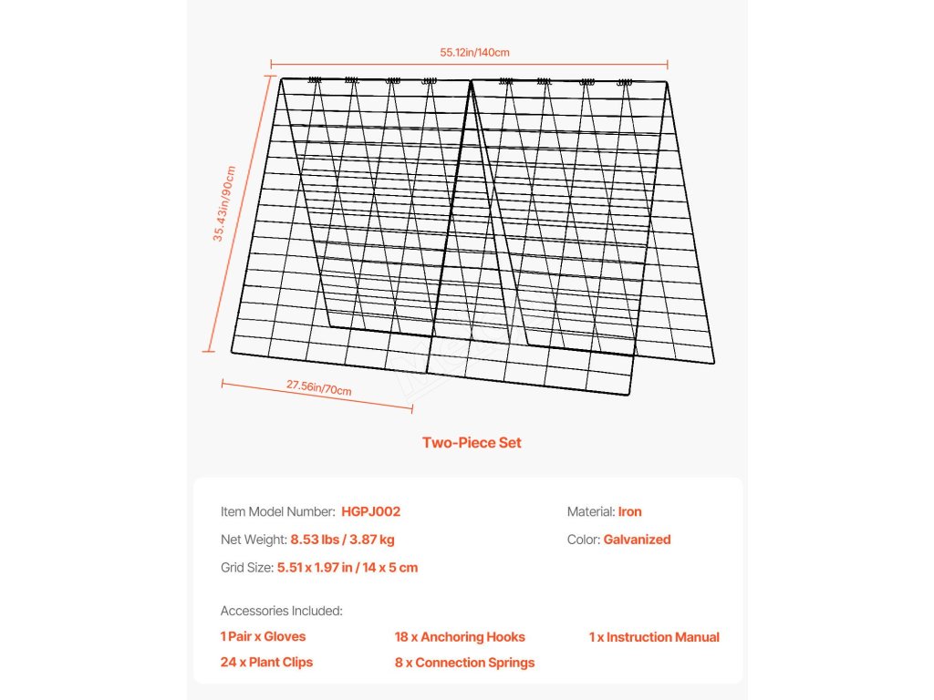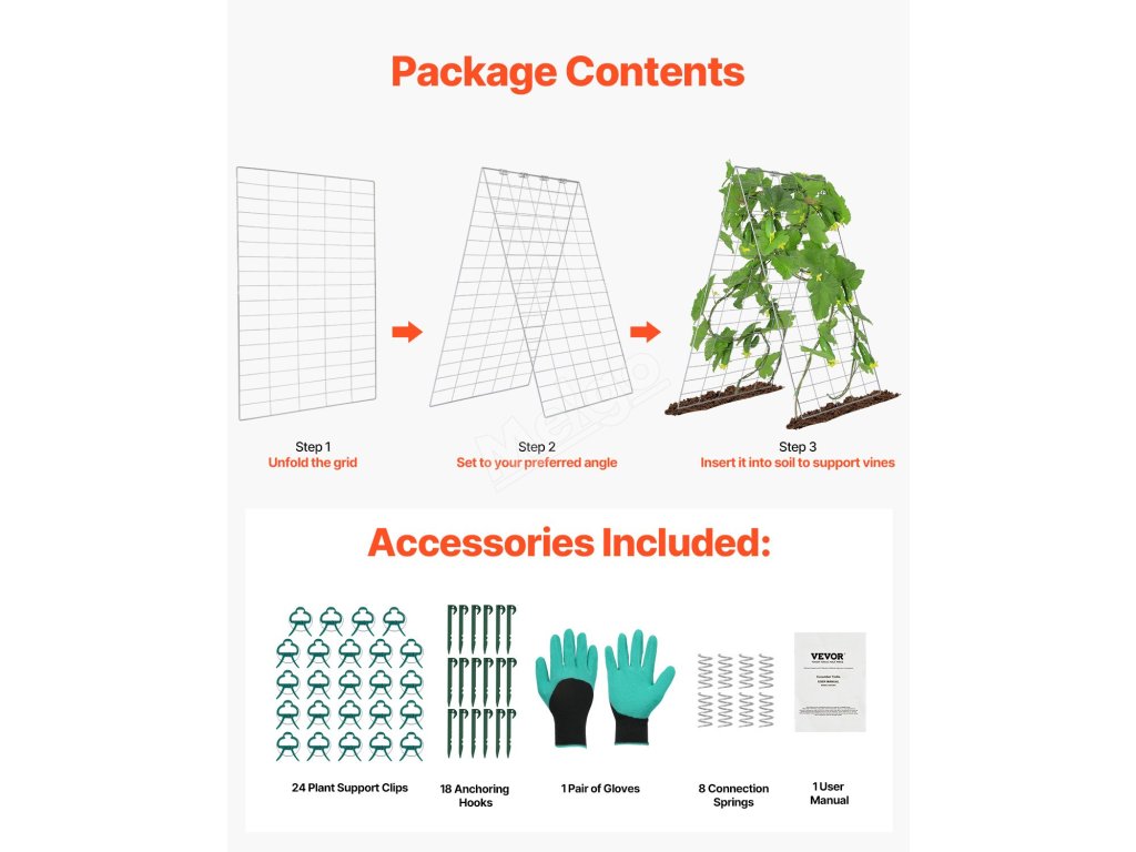 Tato mřížka na okurky je vyrobena z odolného kovového rámu s antikorozní povrchovou úpravou a je pevná a odolná vůči korozi a větru. Nevyžaduje žádné nářadí. Nastavení jednou osobou! Ideální pro okurky a další popínavé rostliny, zlepšuje proudění vzduchu, podporuje růst pro bohatou úrodu.