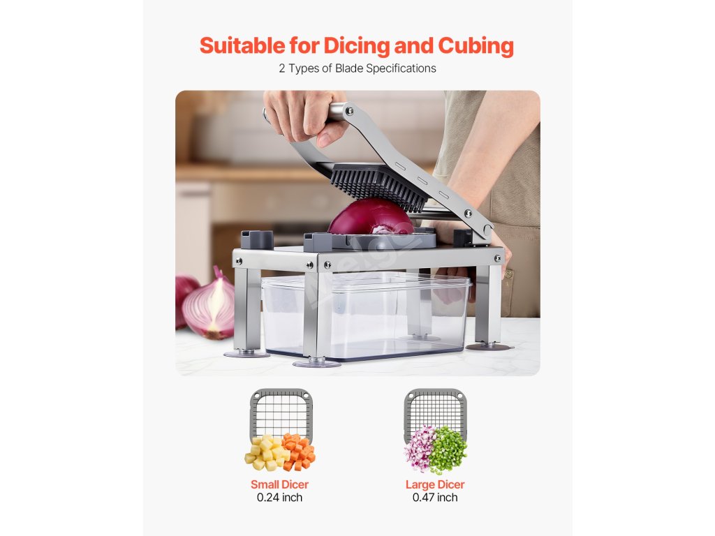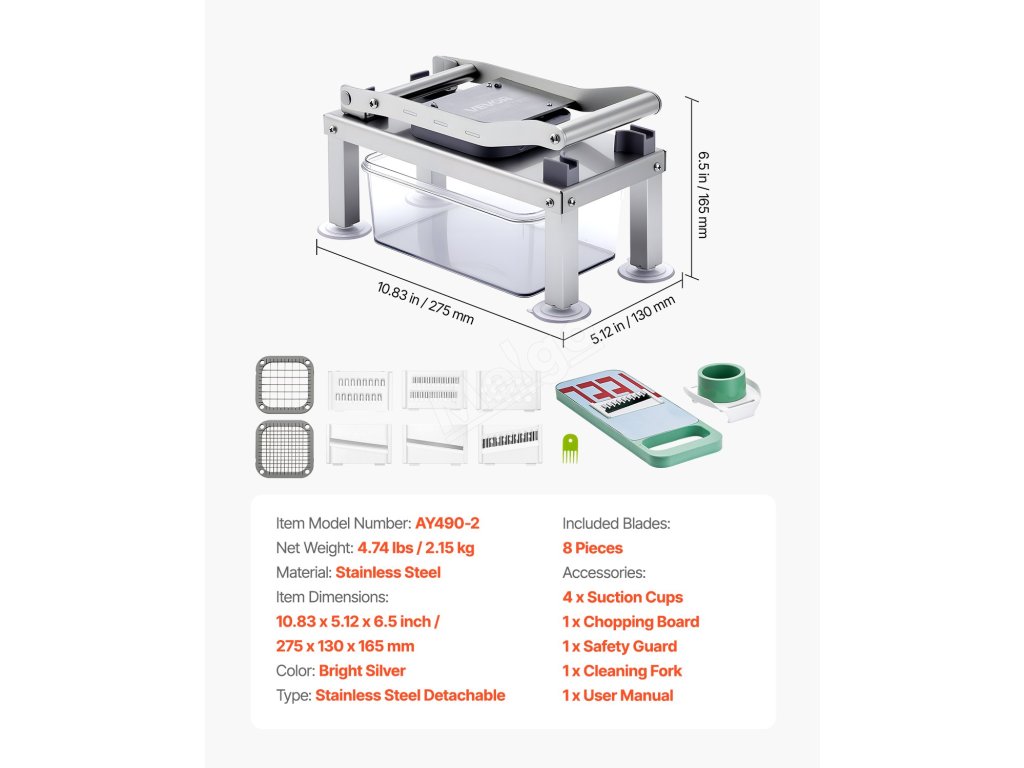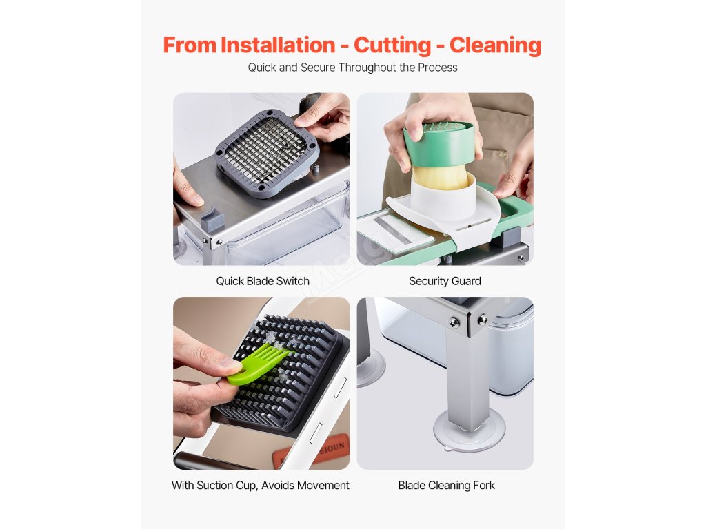 Je vybaven několika velikostmi nožů, které jsou ideální pro okurky, mrkev, brambory a další ingredience, a splňuje tak potřeby různých pokrmů.