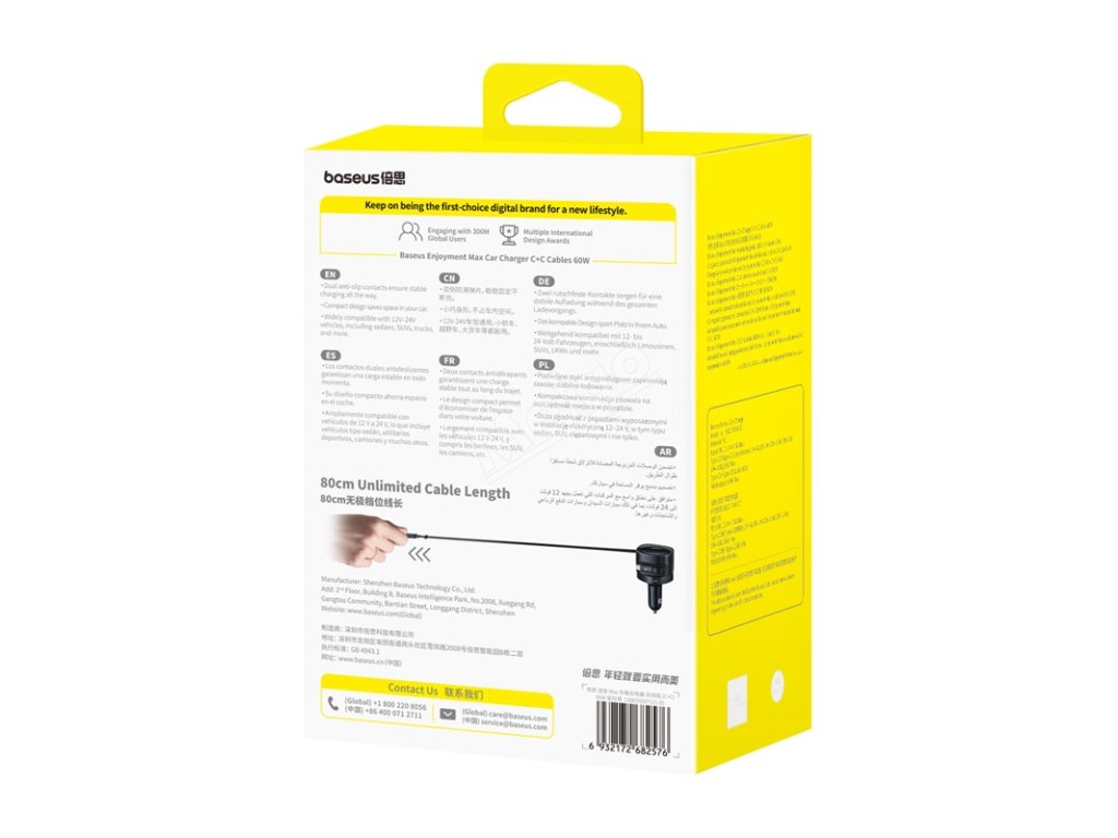 Nabíječka do auta Baseus se dvěma vestavěnými kabely USB-C s celkovým výkonem 60 W umožňuje rychlé nabíjení dvou zařízení současně a je ideální pro řidiče i spolujezdce. Integrovaný bezpečnostní systém, otočná konstrukce a kompatibilita s napětím 12-24 V zajišťují spolehlivost v každém vozidle.