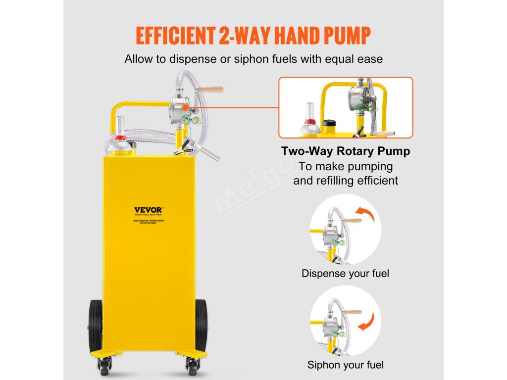 Účinné obousměrné čerpadlo vydává nebo vypouští palivo změnou otáčení kliky, což umožňuje eliminovat přeplňování nádrží odčerpáváním přebytečného benzinu nebo nafty zpět do vany.