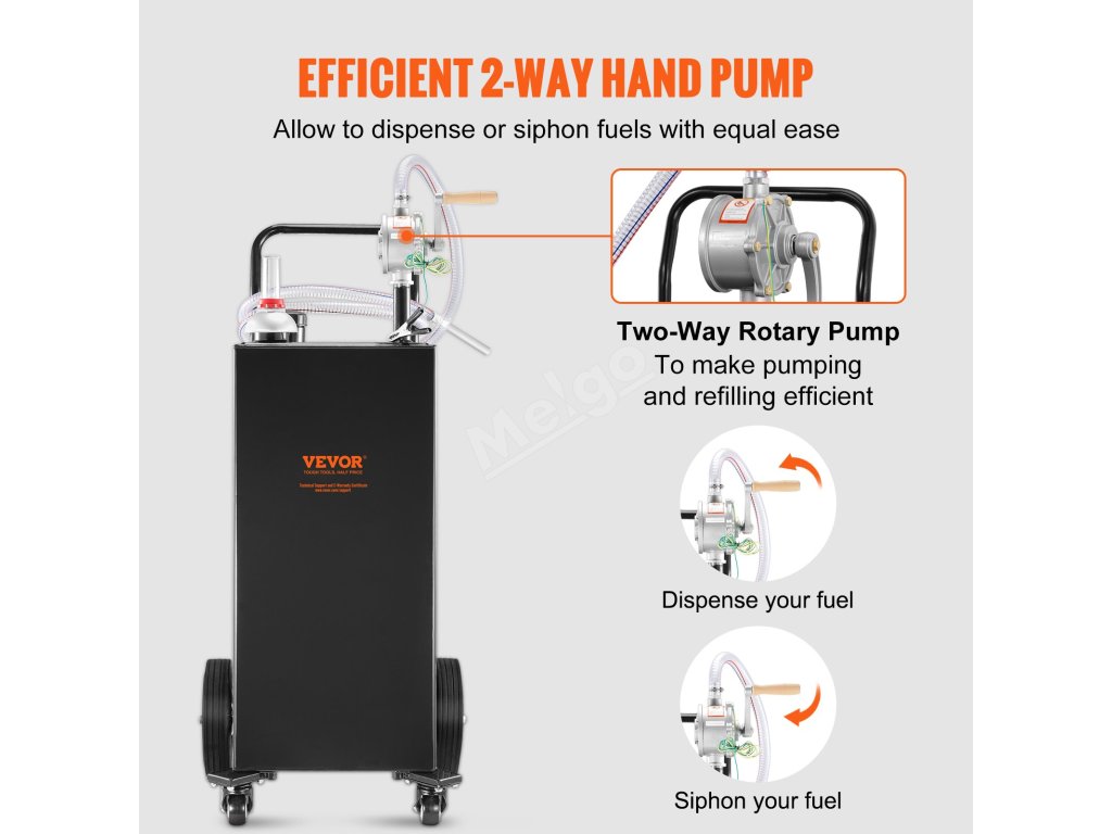 Účinné obousměrné čerpadlo vydává nebo vypouští palivo změnou otáčení kliky, což umožňuje eliminovat přeplňování nádrží odčerpáváním přebytečného benzinu nebo nafty zpět do vany.