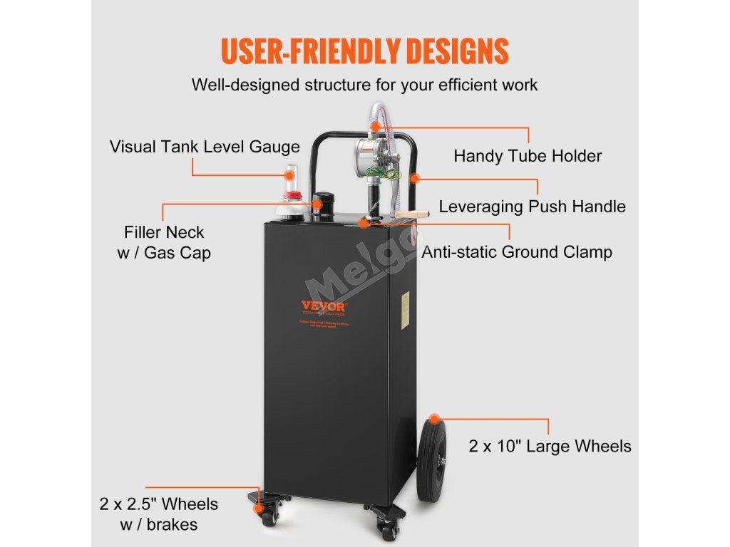 Kádinka Petrol Beaker má prvotřídní design. Obsahuje 10" velká kolečka a 2,5" malá kolečka, antistatickou zemní svorku, plnicí hrdlo s uzávěrem plynu, praktický držák hadice a tlačné madlo s jednoduchou pákou. všechny tyto konstrukce podpoří efektivní a bezpečnou práci.