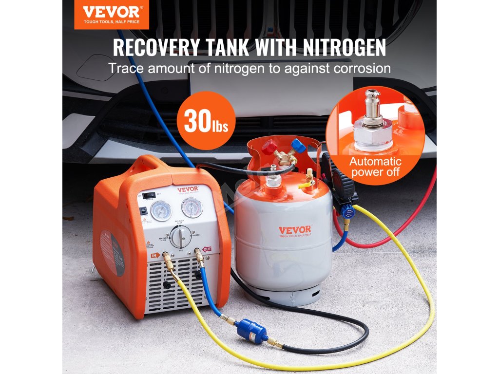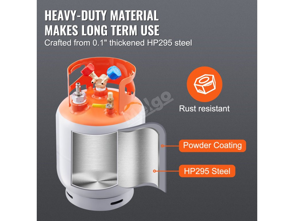 Trvanlivosť nádrže na spätné získavanie chladiva VEVOR je kľúčovým predajným bodom. Je vyrobená z ocele HP295. Tento materiál ponúka vynikajúcu odolnosť proti opotrebovaniu. Nádrž má hrúbku steny 0,1 palca. Zvládne teda náročné používanie. Elegantná prášková farba s vysokým leskom zvyšuje jej odolnosť. Tento náter chráni nádrž pred opotrebovaním. Zosilnené oceľové tesnenie zvyšuje jej životnosť. Táto konštrukcia zaručuje, že nádrž zostane spoľahlivá aj po dlhšom čase. Jej odolná konštrukcia znižuje potrebu častej výmeny, vďaka čomu je dlhodobou investíciou pre rôzne úlohy obnovy.