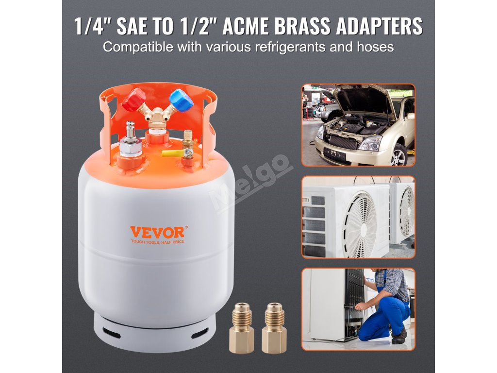 Rekuperačná nádrž VEVOR s plávajúcim spínačom ponúka všestrannú kompatibilitu. Je vybavená ventilom s rozhraním 1/4" SAE. Tento ventil je vhodný pre väčšinu veľkostí hadíc. Dodávané adaptéry zabezpečujú tesnosť tesnenia. Tým sa znižuje riziko úniku. Nádrž je kompatibilná s viacerými chladivami. Medzi ne patria R134A, R-22, R-12, R410A a R404A (R502, R1234YF) a R32. Vďaka tejto flexibilite je teda ideálna pre rôzne aplikácie. Konštrukcia našej nádrže pokrýva nespočetné množstvo potrieb. Vďaka svojej všestrannosti dokáže efektívne zvládnuť rôzne úlohy.