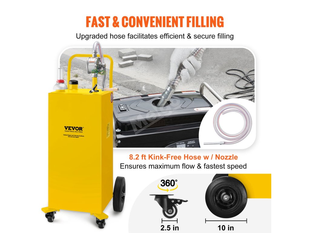 8.2 FT gumová hadice automobilové kvality usnadňuje efektivní a bezpečné tankování. Těžká tryska podporuje rychlý přísun paliva. Stačí otevřít svorku a nechat proudit. Palivovou nádrž naplníte rychle během několika minut.