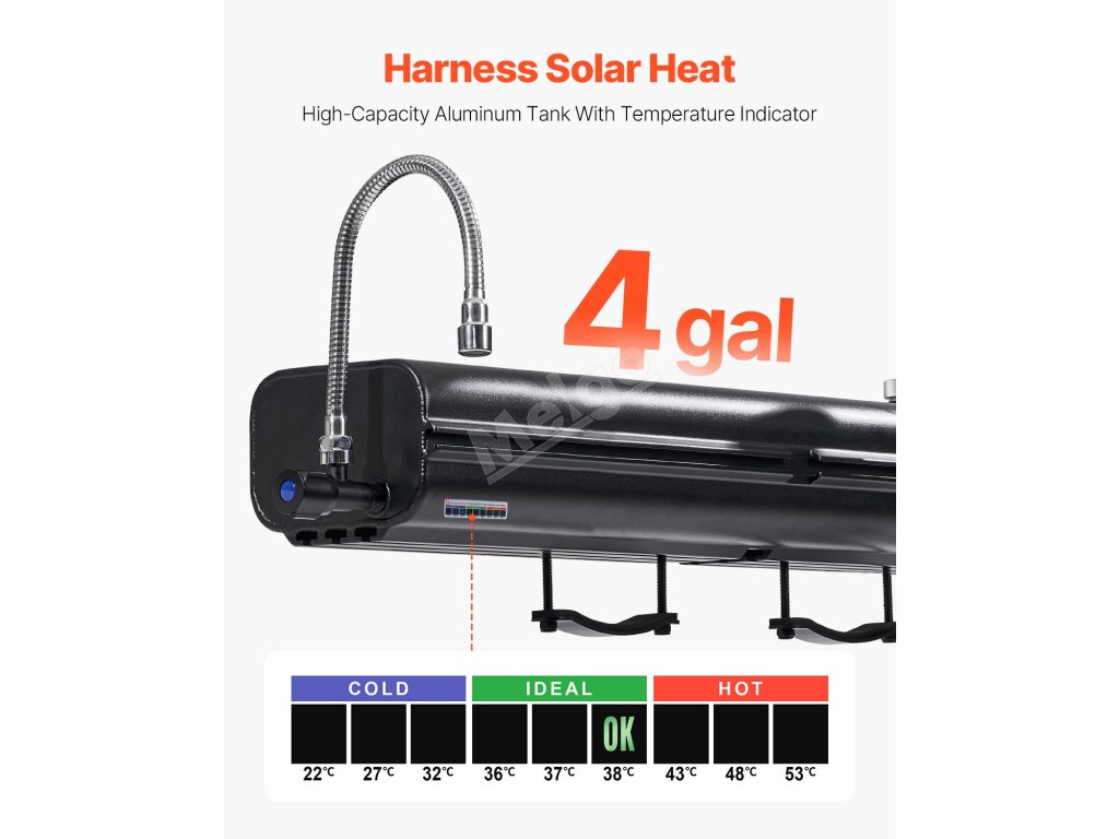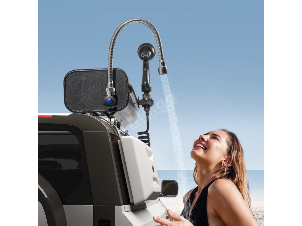 Tento střešní řadový zásobník vody je vybaven snadno čitelným štítkem s teplotou a prodloužením kohoutku. Díky tomu tato sestava umožňuje venkovní sprchování bez použití rukou, což je pro venkovní použití pohodlnější.