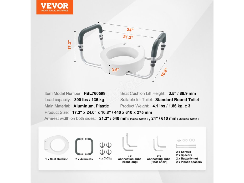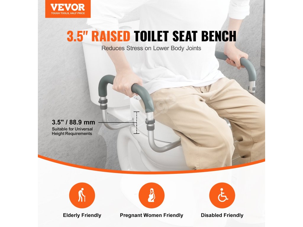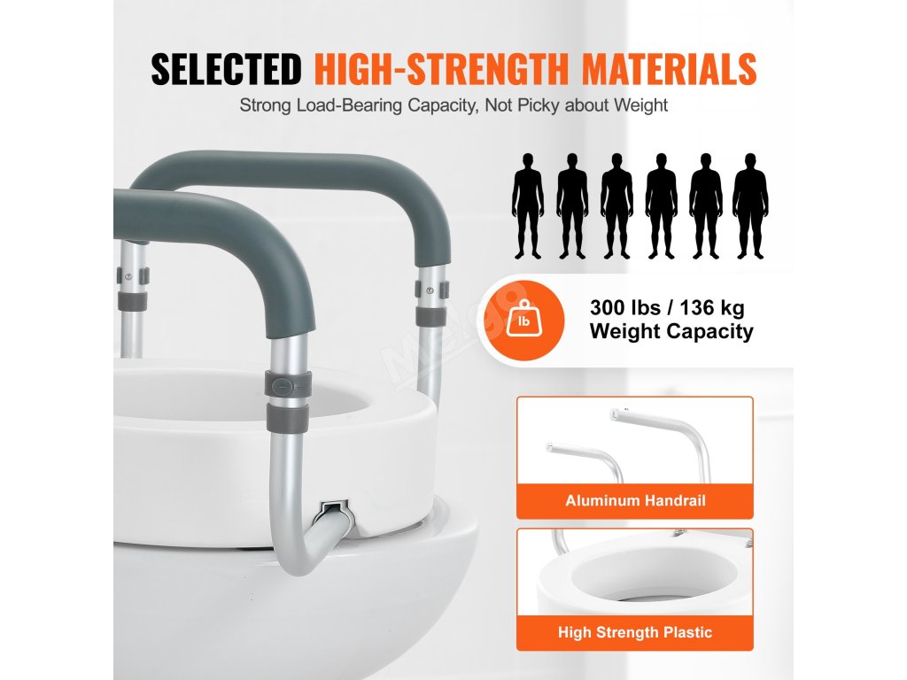 Zvýšené záchodové prkénko vyrobené převážně z hliníku a vysokopevnostního plastu je robustní a odolné, s nosností až 300 kg, takže je bezpečné pro osoby s různou tělesnou hmotností a snadno se celé čistí.
