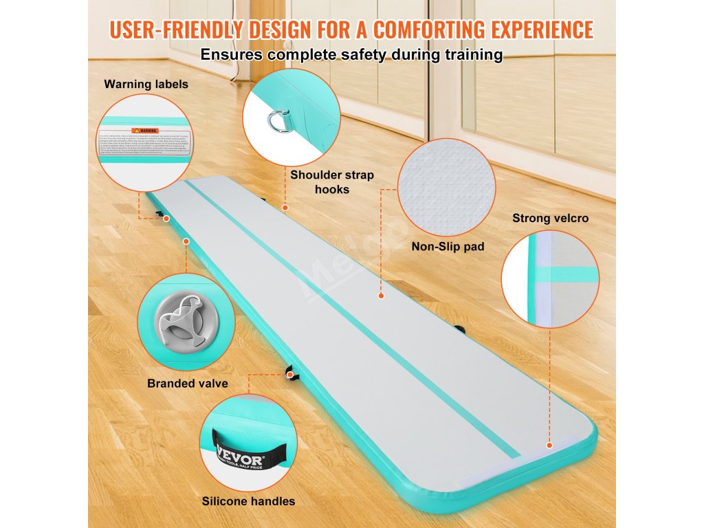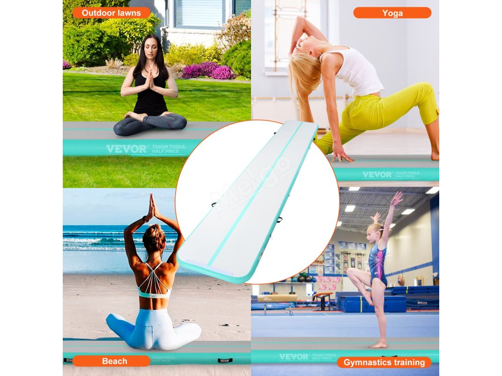 Tato nafukovací gymnastická podložka je měkká, vysoce elastická součást sportovního tréninkového vybavení vyrobená z PVC materiálu. Vyznačuje se voděodolnými, protiskluzovými a ekologickými vlastnostmi. Její vysoká elasticita zajišťuje ochranu před zraněním během cvičení.