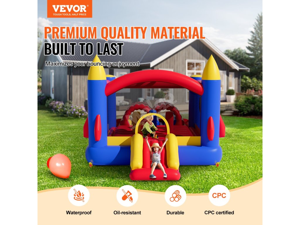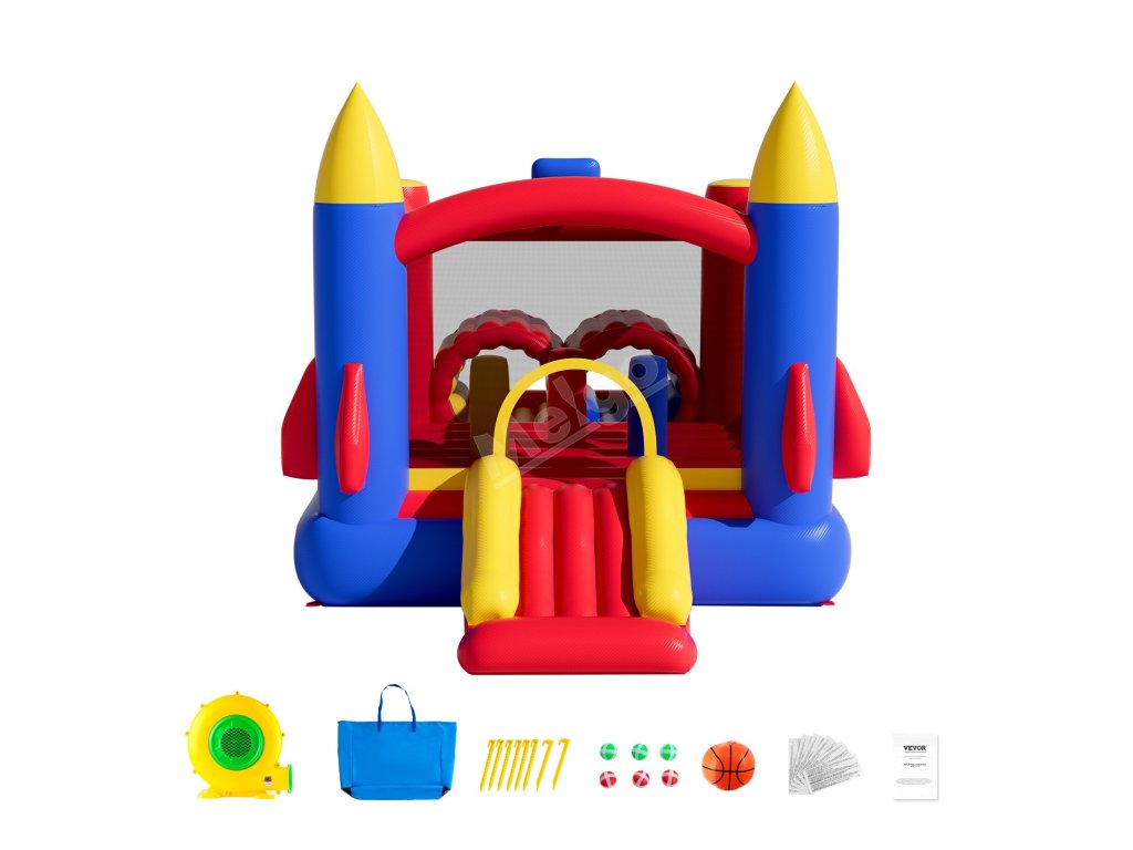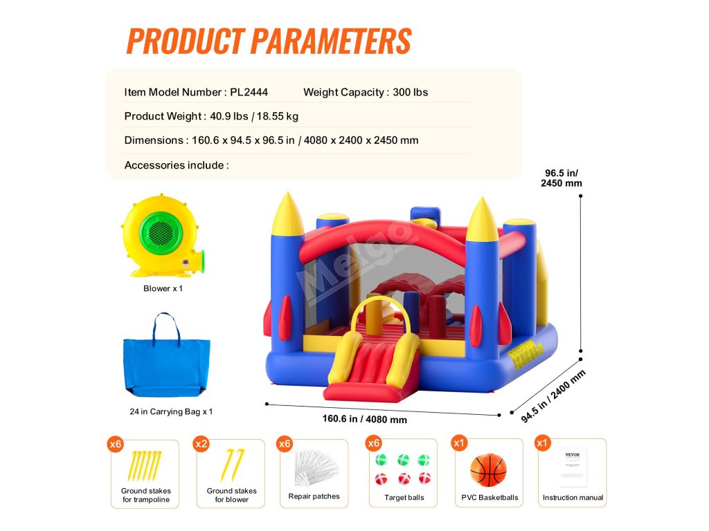 Dětský hrad se skluzavkou je dodáván s přenosnou taškou pro snadnou přepravu. Montáž a demontáž jsou jednoduché, nafouknutí trvá méně než 3 minuty. Před rozložením pro nafouknutí nezapomeňte zkontrolovat, zda na zemi nejsou ostré předměty.