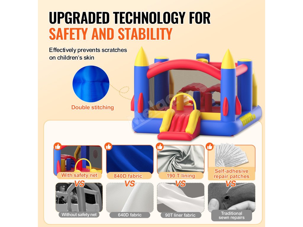 Skákací hrad využívá podšívku 190T + tkaninu 840D oxford pro zvýšení odolnosti. Nosítka a spoje využívají technologii dvojitého prošití, která zabraňuje poškrábání dětské pokožky, a to i v šortkách. Bezpečnostní síť maximalizuje větrání a zabraňuje pádu dětí na zem ze stran.