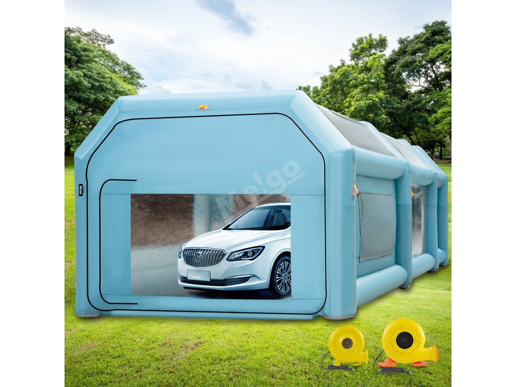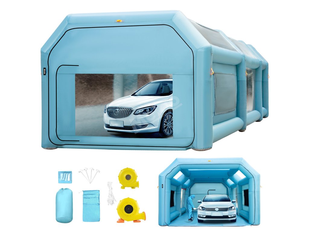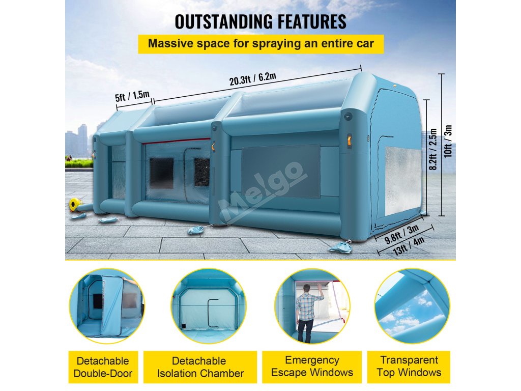 Nafukovací lakovací kabina používá tkaninu 210D oxford a materiál PVC, který je odolný a odolný vůči nečistotám. Její vnější rozměry: 26 x 13 x 10 stop Stříkací kabina je dostatečně prostorná pro auto.