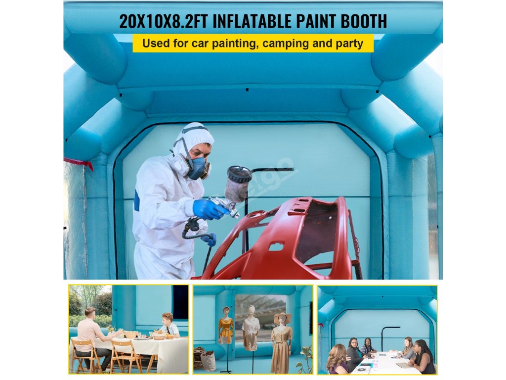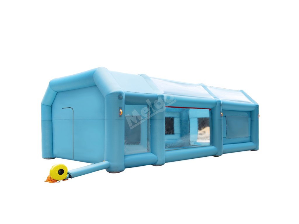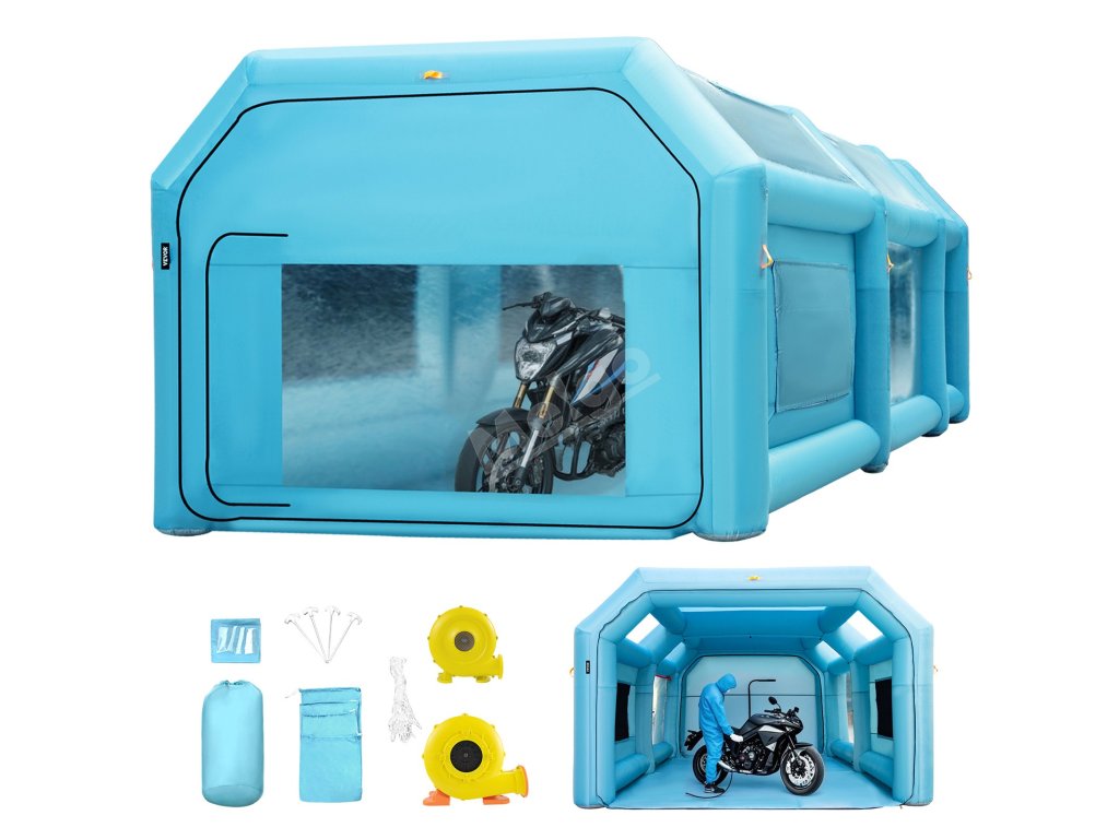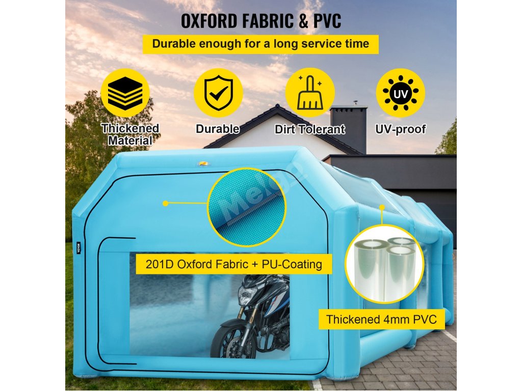 Nafukovací lakovací kabina používá tkaninu 201D oxford a materiál PVC, který je odolný a snáší nečistoty. Její vnější rozměry: 20 x 10 x 8,2 m. Stříkací kabina je dostatečně prostorná pro motocykly a automobilové díly.