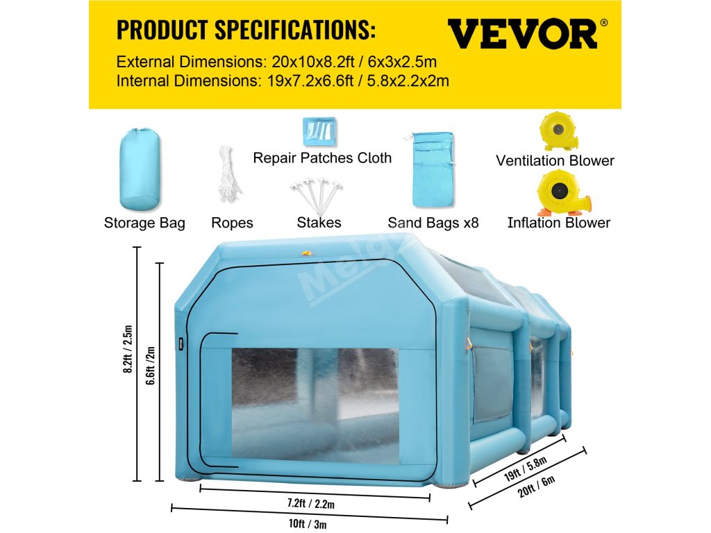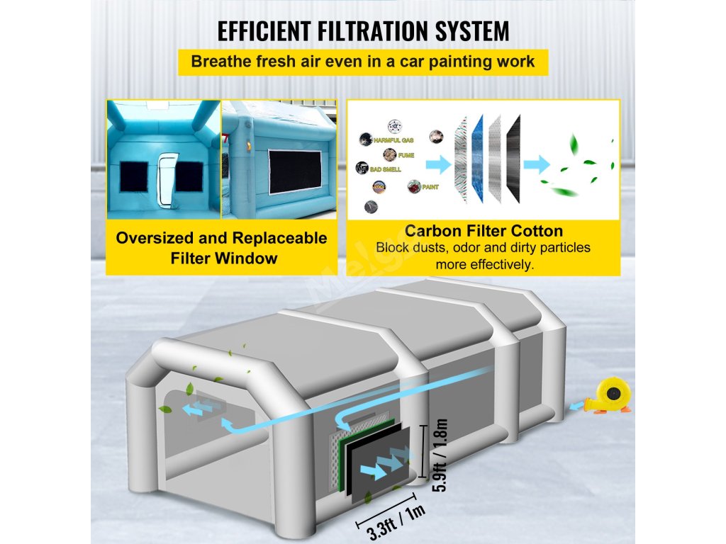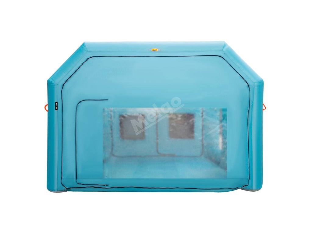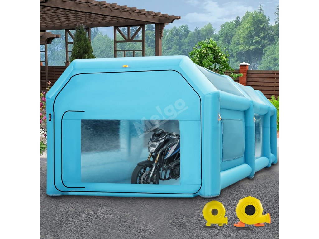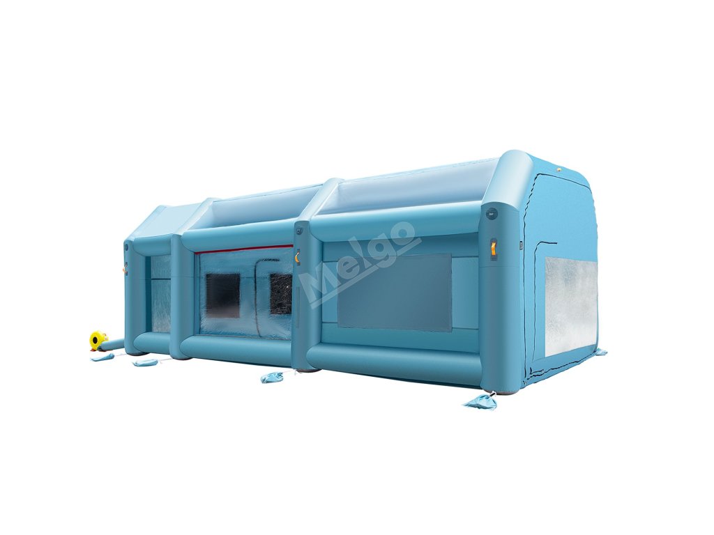 Nafukovací lakovací kabina používá tkaninu 201D oxford a materiál PVC, který je odolný a snáší nečistoty. Její vnější rozměry: 20 x 10 x 8,2 m. Stříkací kabina je dostatečně prostorná pro motocykly a automobilové díly.