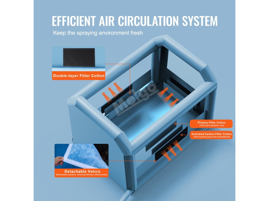 Nafukovací stříkací kabina vybavená dvouvrstvou filtrační bavlnou včetně primárního filtru a filtru s aktivním uhlím zabraňuje úniku škodlivých plynů a zajišťuje nepřerušované lakování. Filtrační okénka jsou opatřena odnímatelnými suchými zipy, což umožňuje jejich výměnu kdykoli.