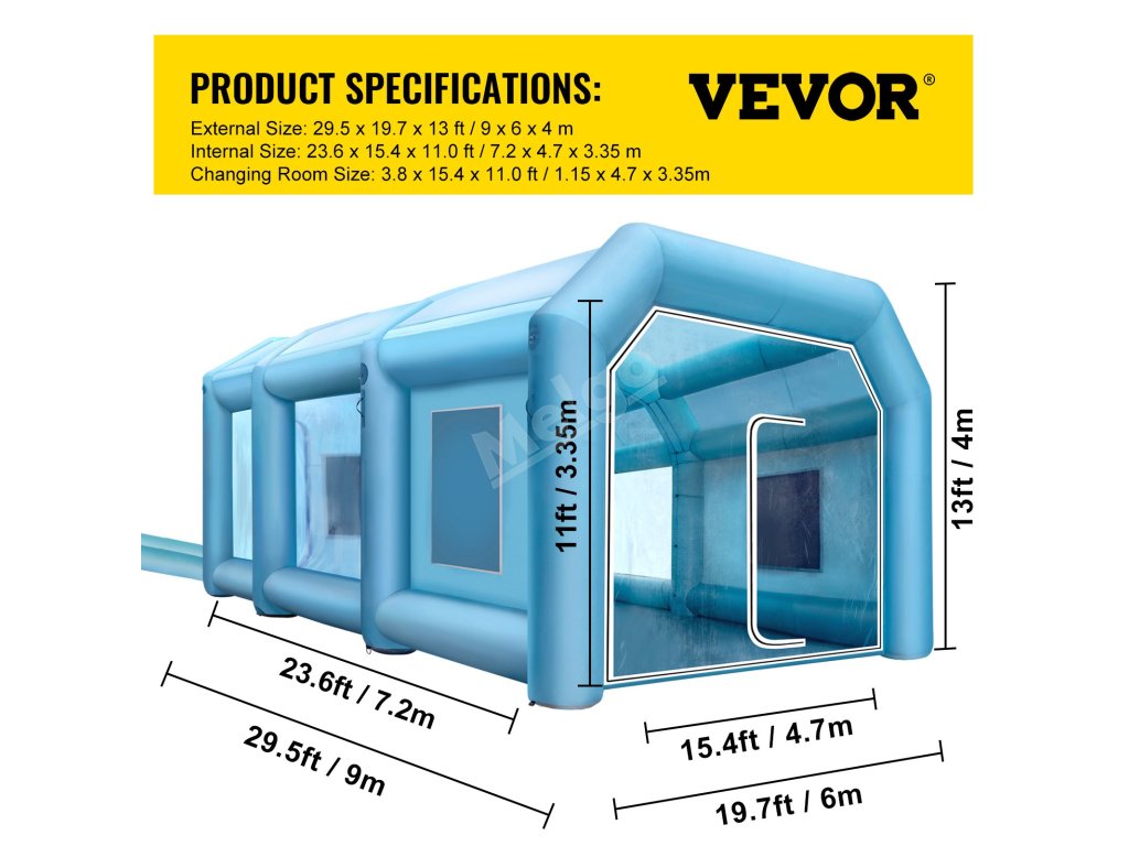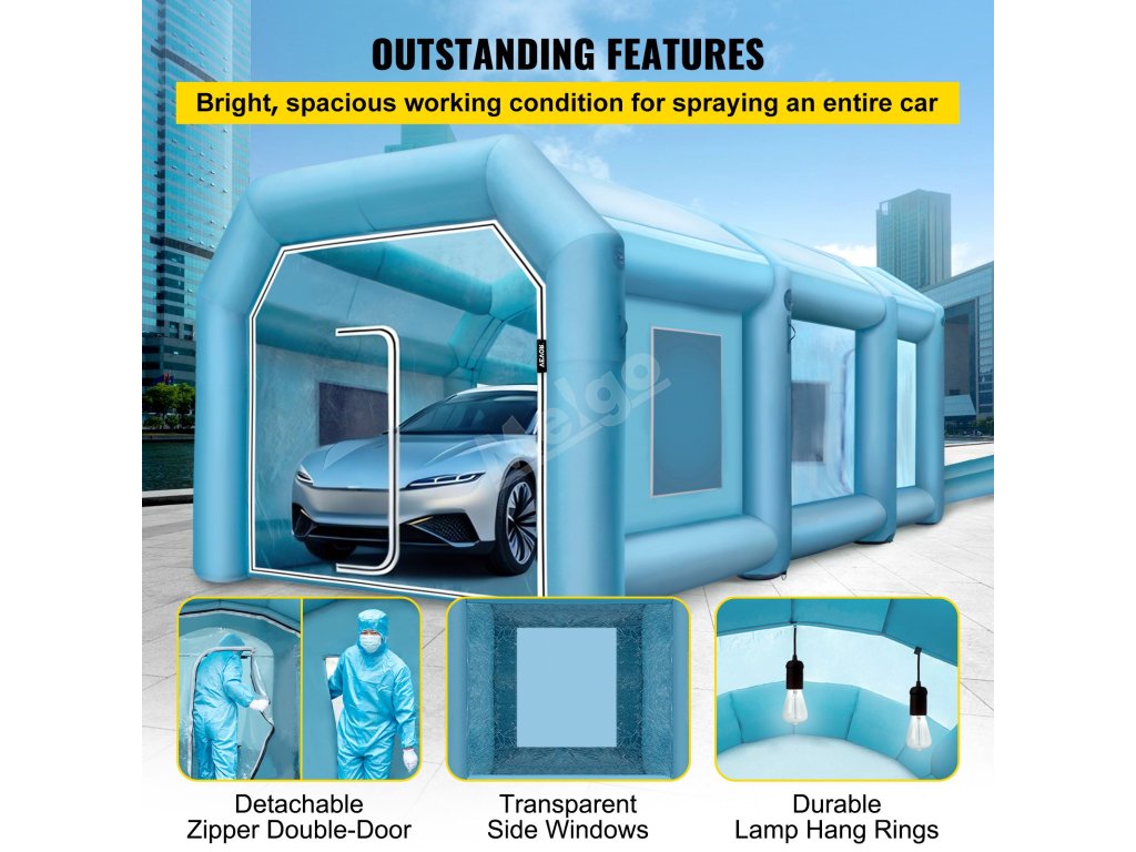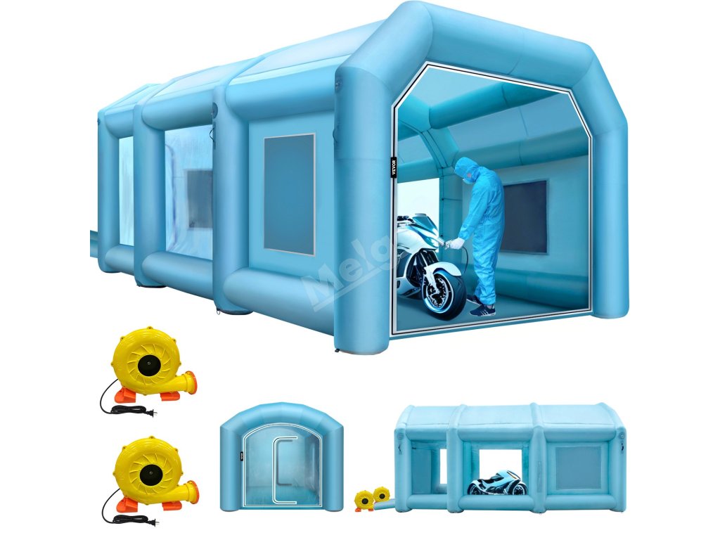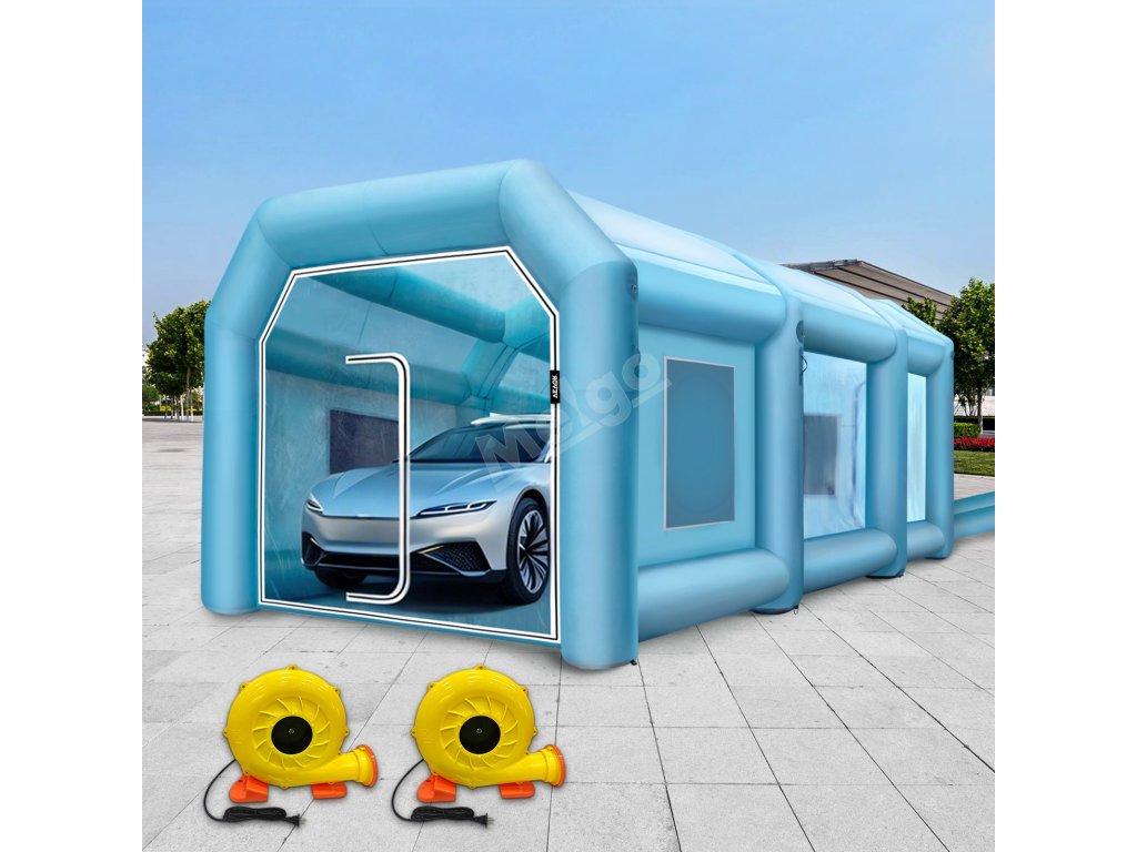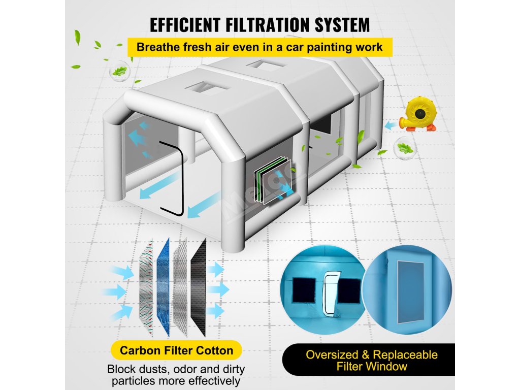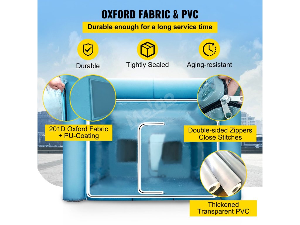 Nafukovací lakovací kabina používá tkaninu 201D oxford a materiál PVC, který je odolný a za každého počasí odolný proti znečištění. Stříkací kabina je dostatečně prostorná pro auto.
