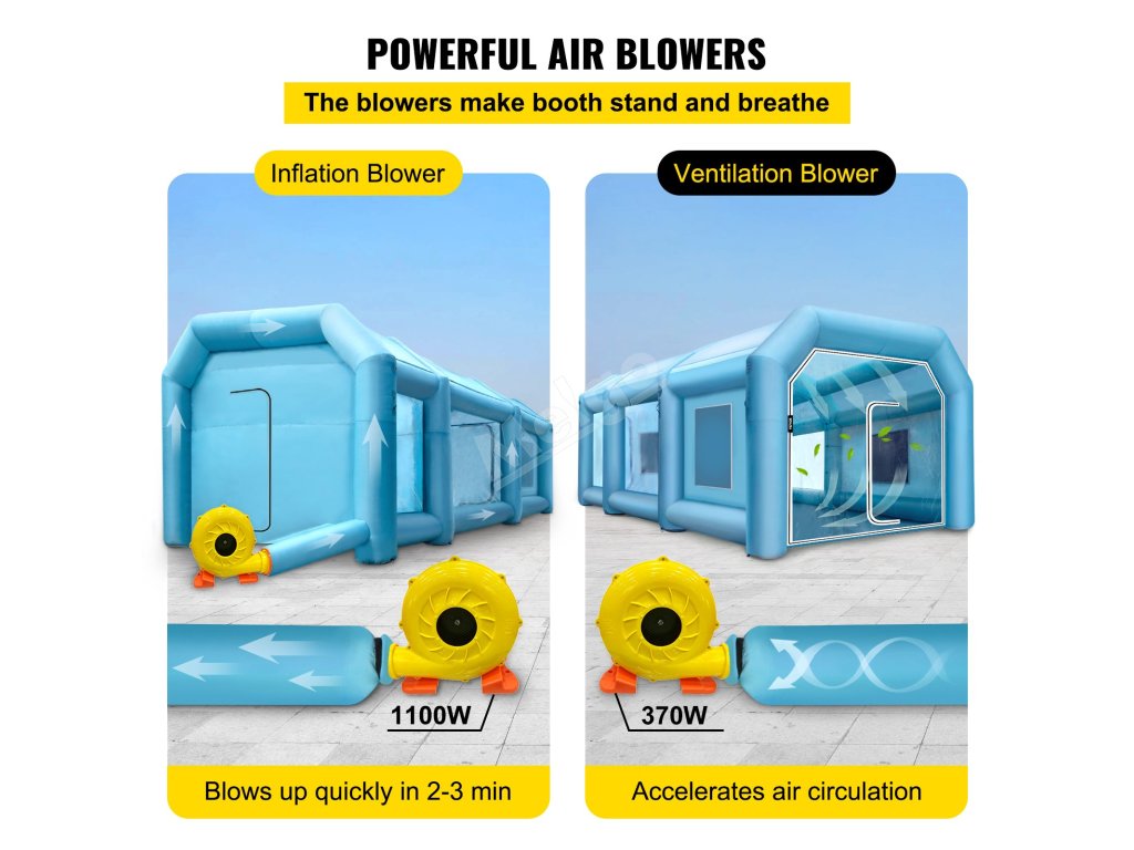 Nafukovací lakovací kabina 9×6×4 m s filtrem a 2 ventilátory