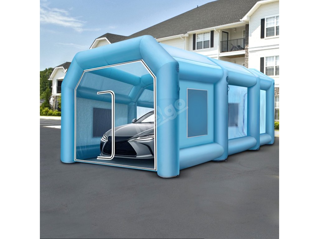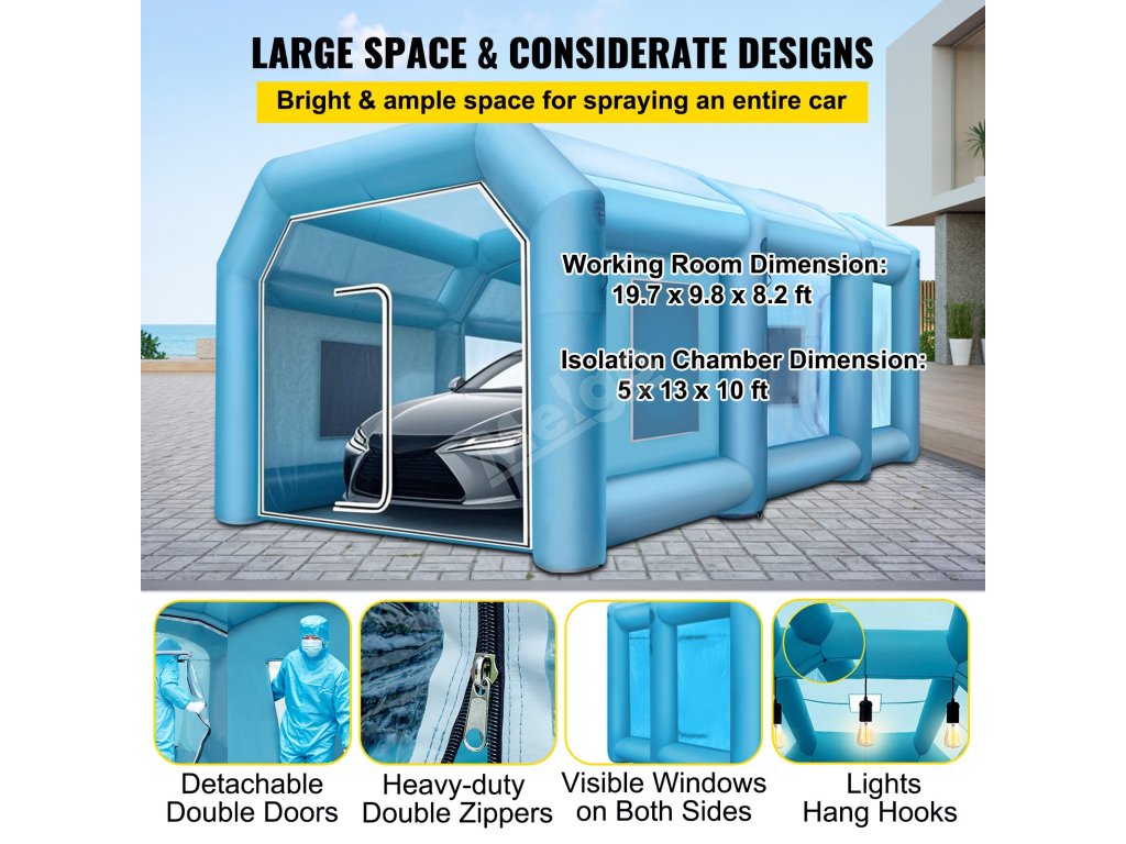 Nafukovací lakovací kabina využívá tkaninu Oxford 210D a materiál PVC, který je odolný, neroztrhne se a je odolný proti znečištění. Její vnější rozměry: 26 x 13 x 10 stop Je dostatečně prostorná, aby se do ní vešel automobil nebo motocykl, který potřebuje natřít.