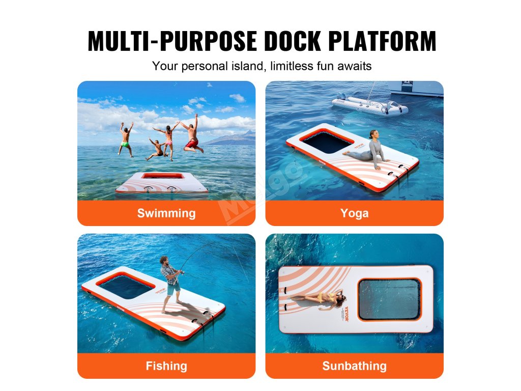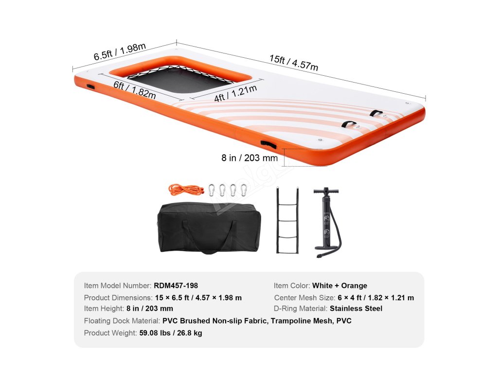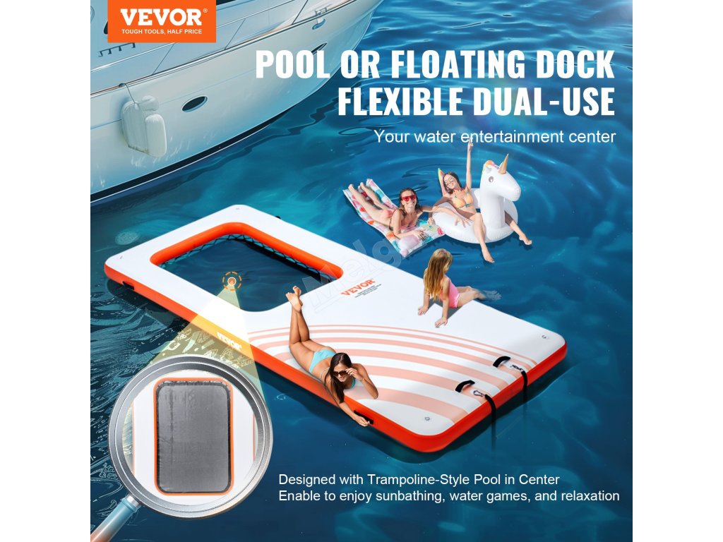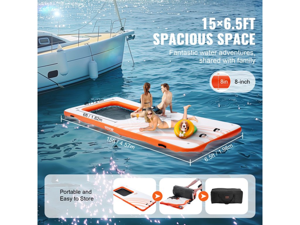 Ponořte se do nekonečné vodní zábavy s inovativním nafukovacím dokem VEVOR o rozměrech 15 x 6,5 stop! Díky prostornému bazénu s trampolínovou sítí o rozměrech 4*6 stop, vysoce kvalitním materiálům, snadnému nafukování a vyfukování, bezpečnému ukotvení a širokému spektru využití je dokonalým doplňkem pro bezpečné a zábavné vodní dobrodružství.