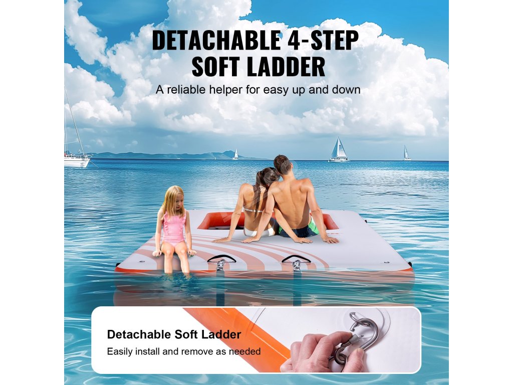 Náš odnímatelný čtyřstupňový měkký žebřík umožňuje bezproblémové nastupování a vystupování z plošiny. Ať už jste dítě nebo dospělý, a zejména pokud nejste zdatný plavec, tento žebřík vám zajistí snadný přístup a zvýší požitek a bezpečnost vašich vodních dobrodružství.