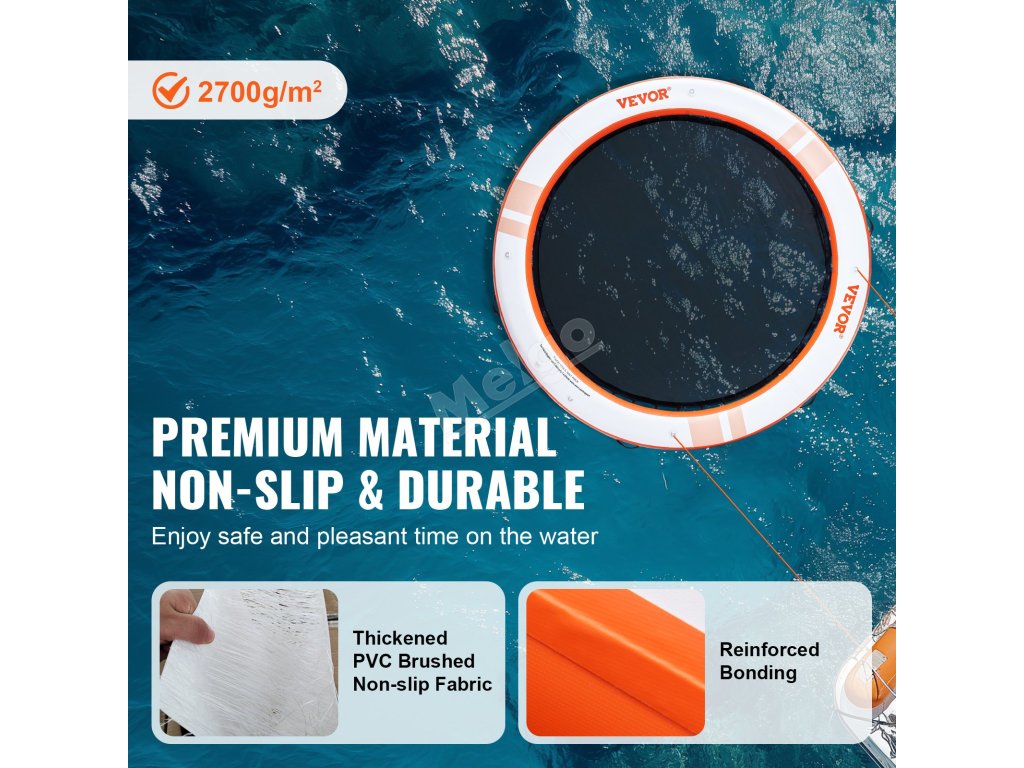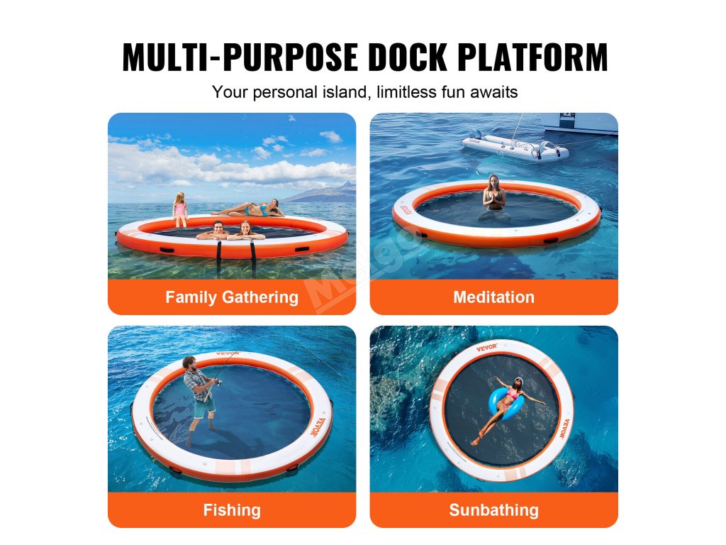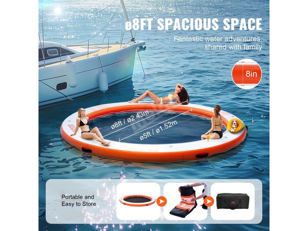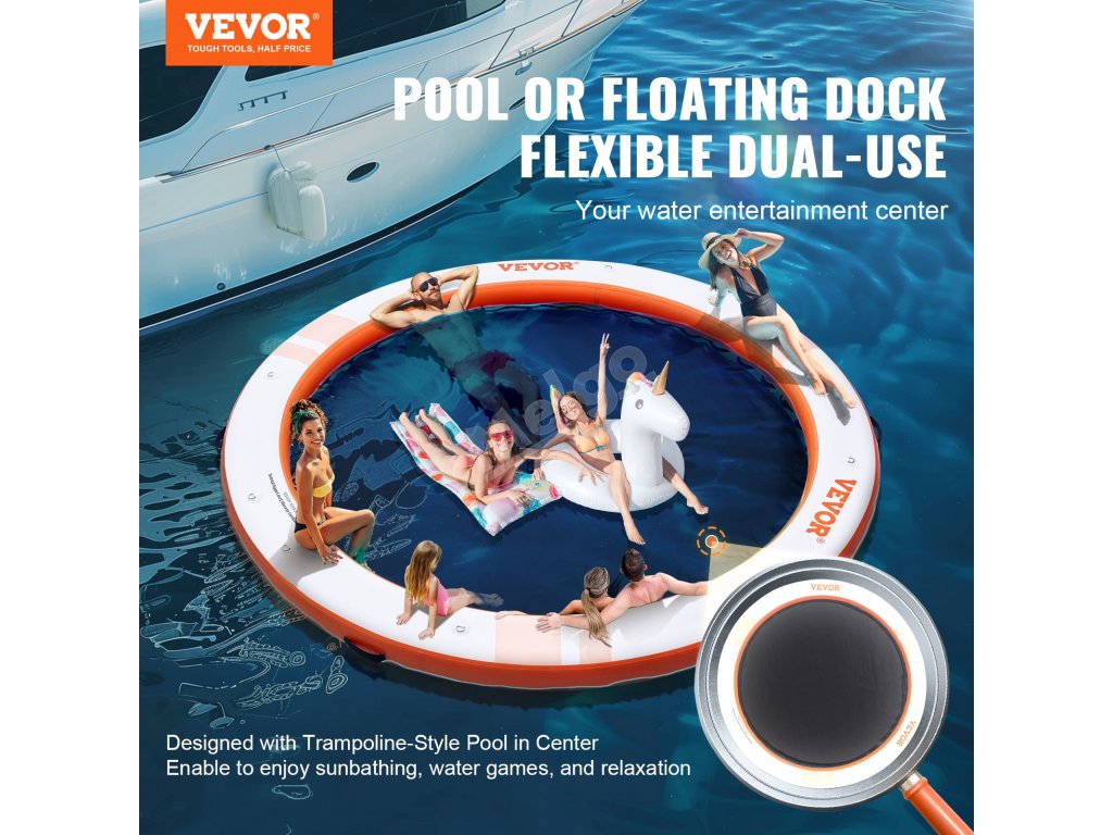 Ponořte se do nekonečné vodní zábavy s inovativním nafukovacím dokem VEVOR ø8 stop! Díky prostornému kulatému bazénu s trampolínovou sítí ø5 stop, vysoce kvalitním materiálům, snadnému nafukování a vyfukování, bezpečnému ukotvení a širokému spektru využití je dokonalým doplňkem pro bezpečné a zábavné vodní dobrodružství.