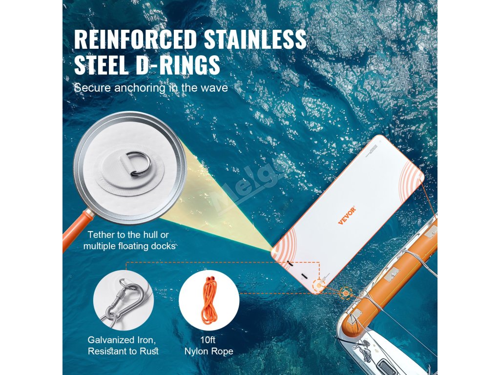 Poskytujeme profesionální kotvící systém, který zajistí stabilitu při jakékoli rekreaci na vodě. Naše plovoucí plošina, vybavená 6 nerezovými D-kroužky, 6 vyztuženými úchyty, 4 háky a 10 stop dlouhým nylonovým lanem, zůstává bezpečně ukotvena ve vodě a poskytuje vysokou bezpečnost a stabilitu.