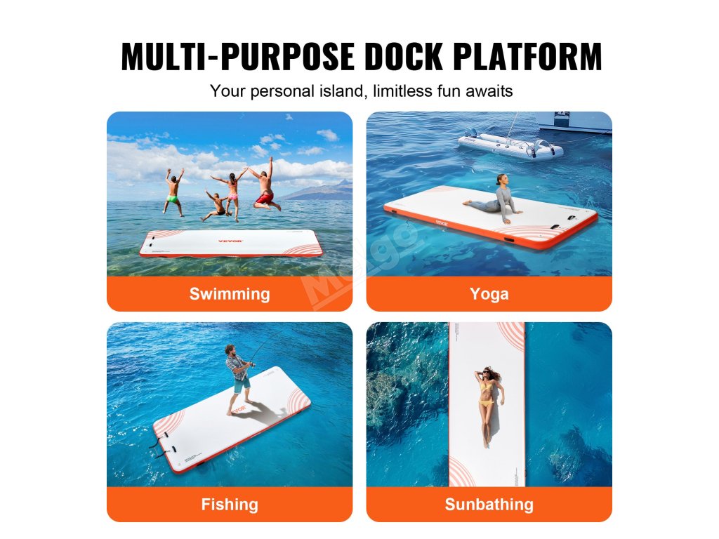 Naše plovoucí přístavní plošina je nejen vodní hřiště, ale také ideální místo pro různé aktivity. Tuto nafukovací přístavní plošinu můžete využít ke strávení nezapomenutelných chvil zábavy na vodě s přáteli a rodinou při opalování, plavání, potápění, opalování, cvičení jógy atd.