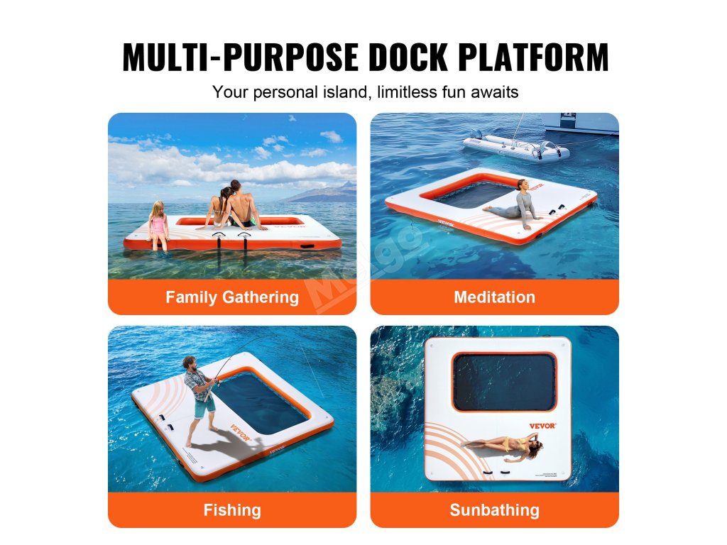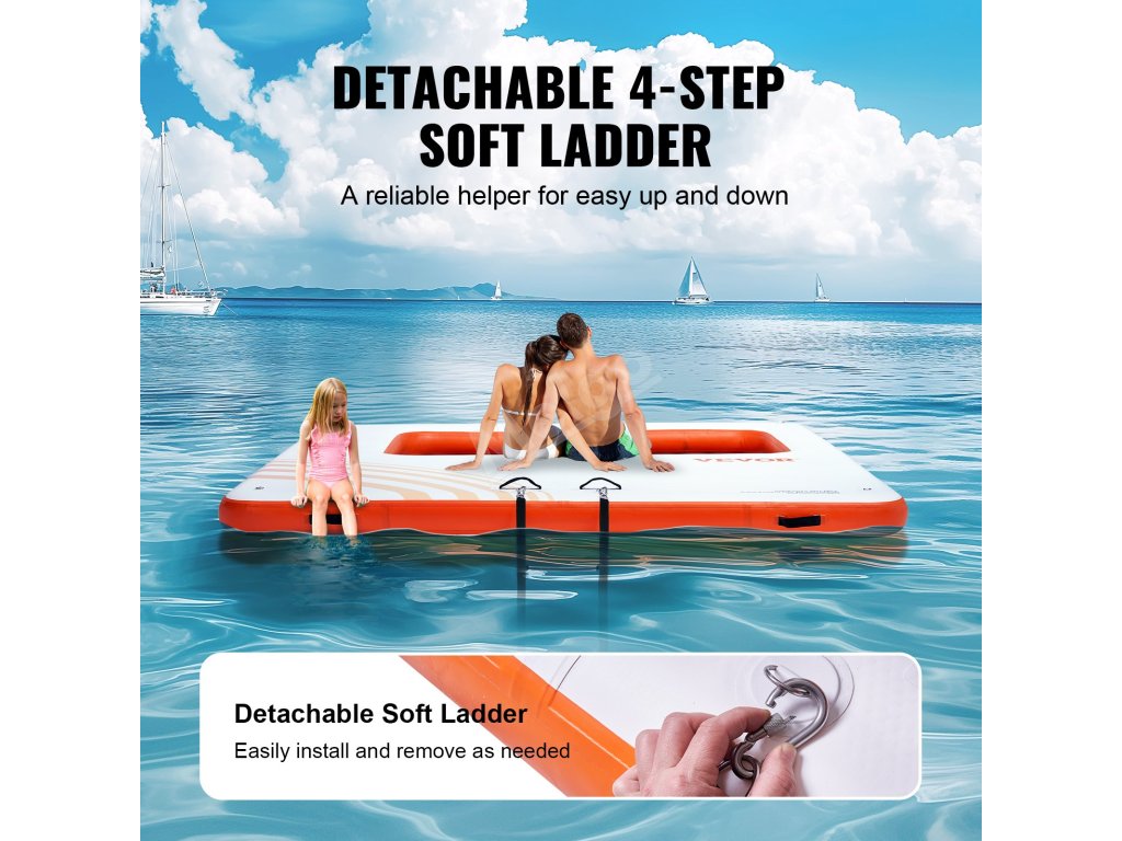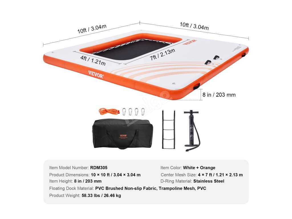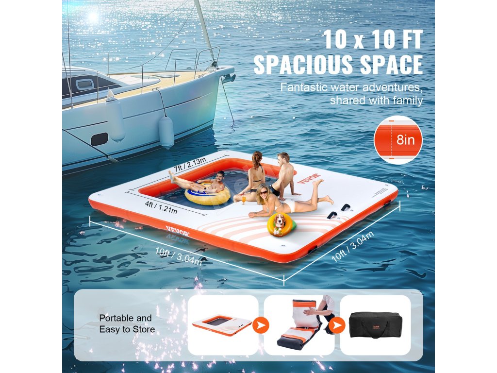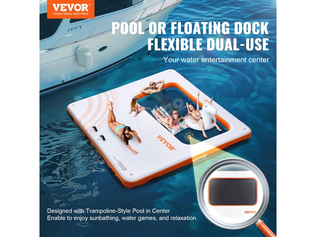 Ponořte se do nekonečné vodní zábavy s inovativním nafukovacím dokem VEVOR 10 x 10 stop! Díky prostornému bazénu s trampolínovou sítí o rozměrech 4*7 stop, vysoce kvalitním materiálům, snadnému nafukování a vyfukování, bezpečnému ukotvení a širokému spektru využití je dokonalým doplňkem pro bezpečné a zábavné vodní dobrodružství.