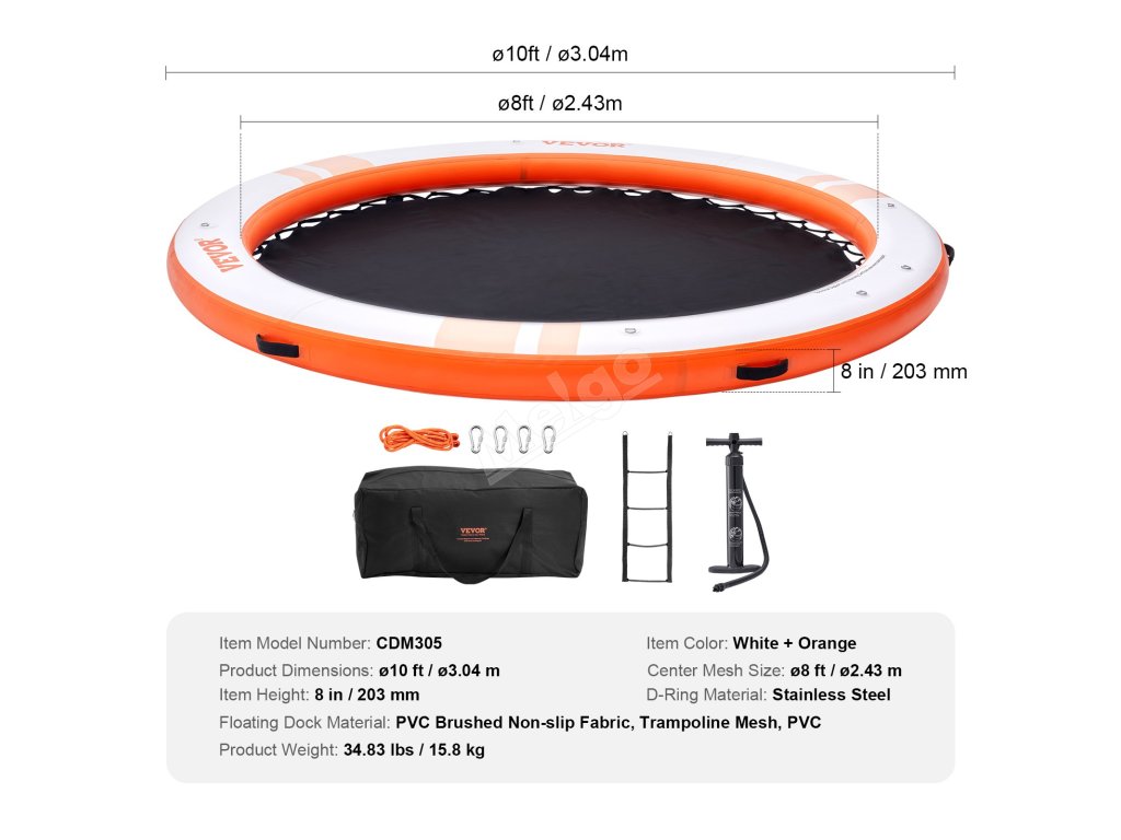 Ponořte se do nekonečné vodní zábavy s inovativním nafukovacím dokem VEVOR ø10 stop! Díky prostornému kulatému bazénu s trampolínovou sítí ø8 stop, vysoce kvalitnímu materiálu, snadnému nafukování a vyfukování, bezpečnému ukotvení a širokému spektru využití je dokonalým doplňkem pro bezpečné a zábavné vodní dobrodružství.