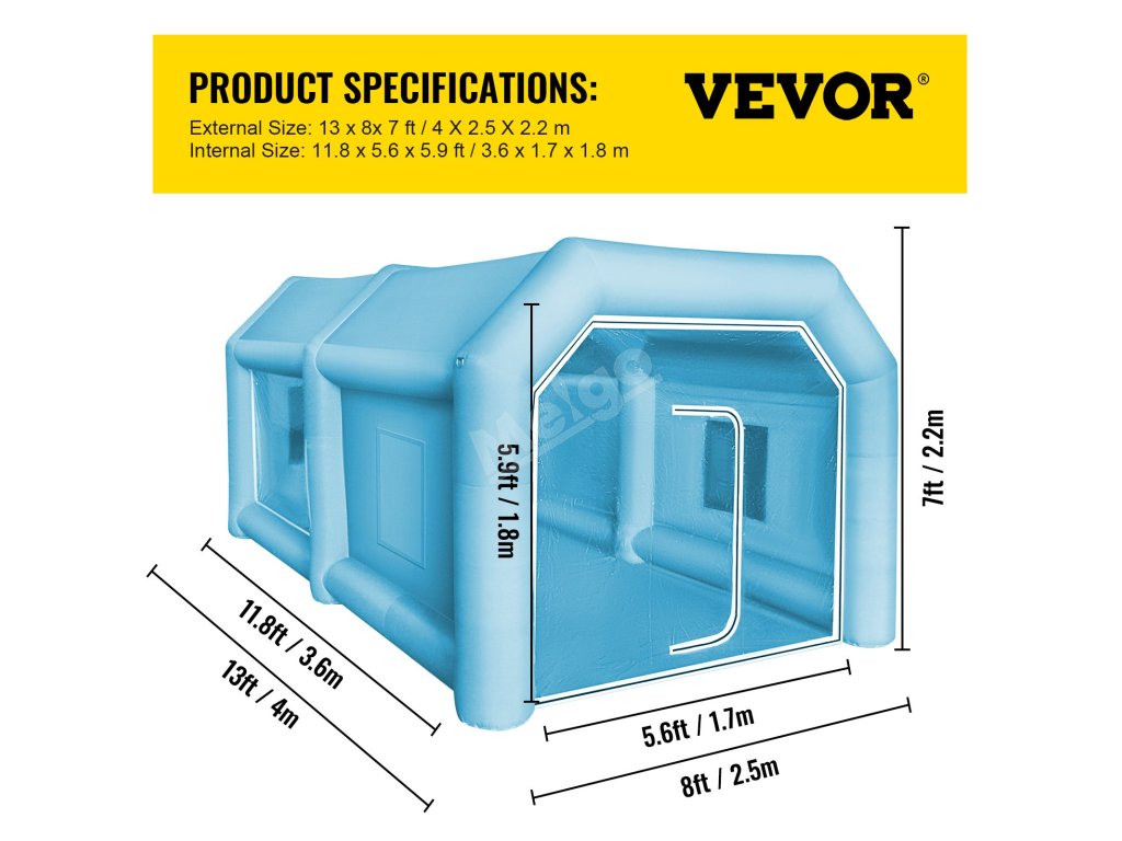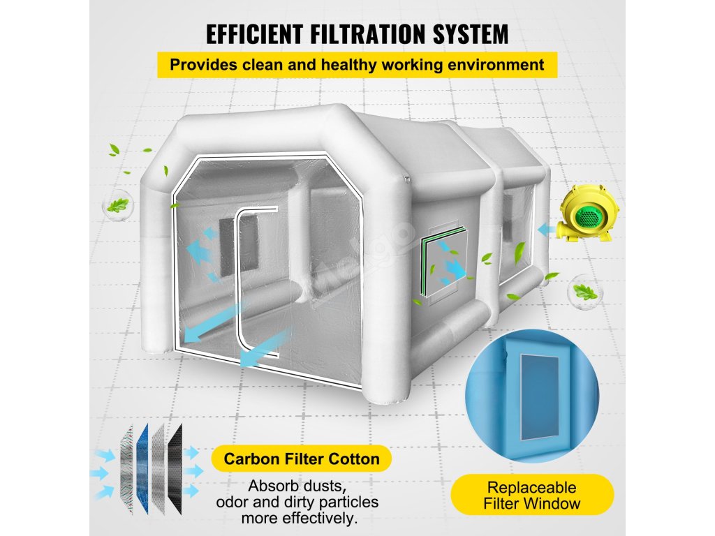Nafukovací lakovací kabina využívá tkaninu Oxford 210D a materiál PVC, který je odolný, neroztrhne se a je odolný proti znečištění. Její vnější rozměry: 13 x 8 x 7 stop. Je dostatečně prostorná na lakování automobilu nebo motocyklu.