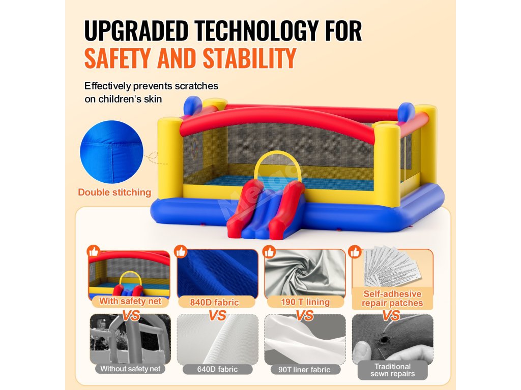 Skákací hrad využívá podšívku 190T + tkaninu 840D oxford pro zvýšení odolnosti. Nosítka a spoje využívají technologii dvojitého prošití, která zabraňuje poškrábání dětské pokožky, a to i v šortkách. Bezpečnostní síť maximalizuje větrání a zabraňuje pádu dětí na zem ze stran.